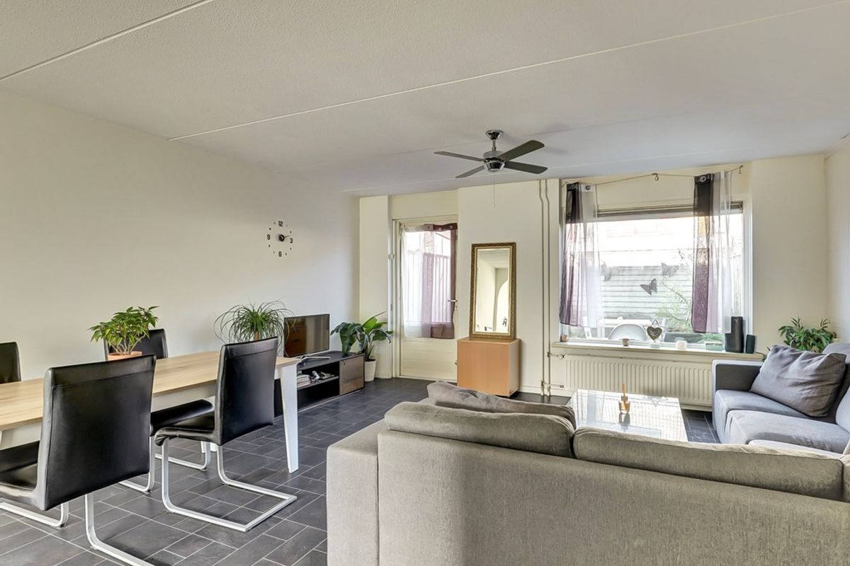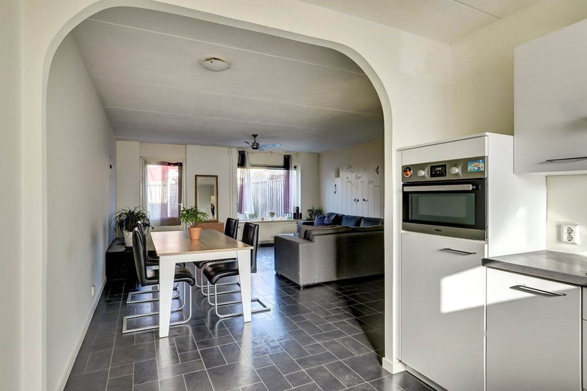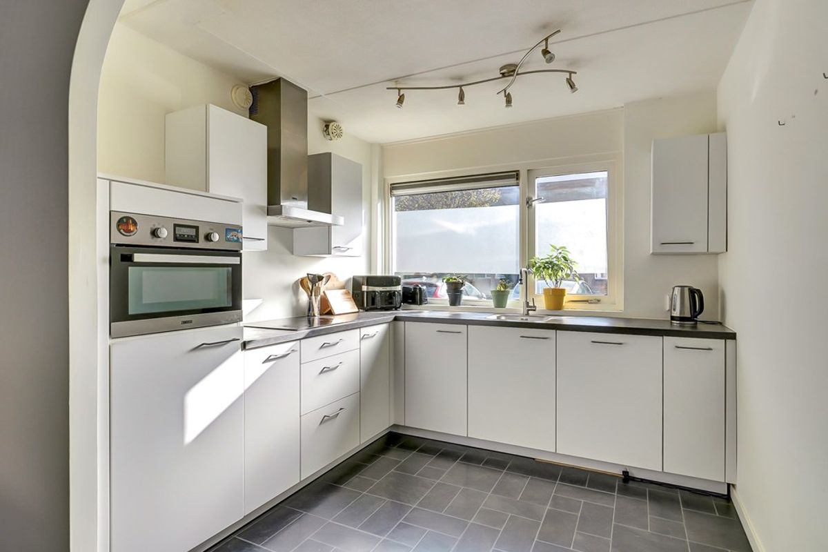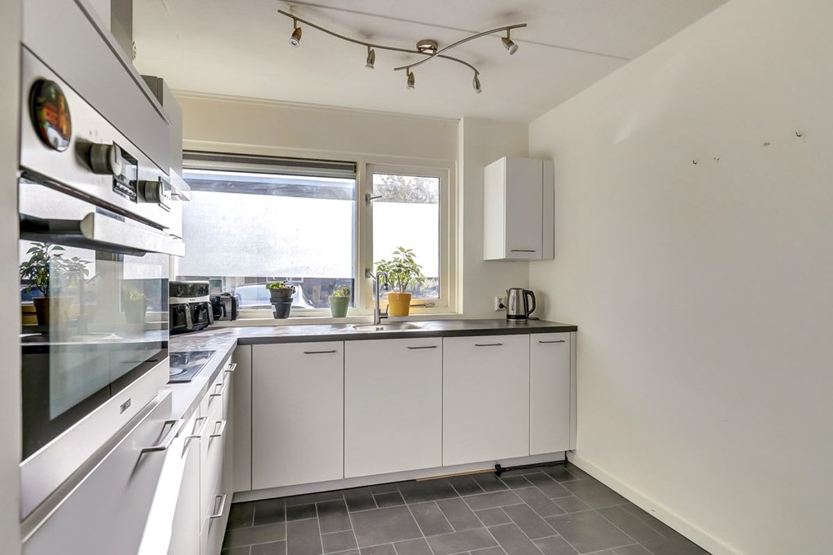 De woonkamer is voorzien van laminaattegel, witte plinten en glad gestuukte wanden. Er is een praktische trapkast en een moderne keuken die is voorzien van een inductie kookplaat, een RVS afzuigschouw, een oven, een koelkast en een vaatwasser.