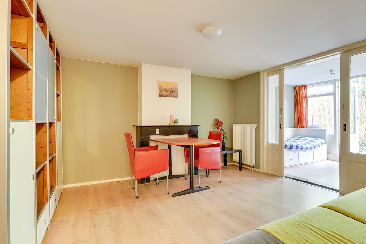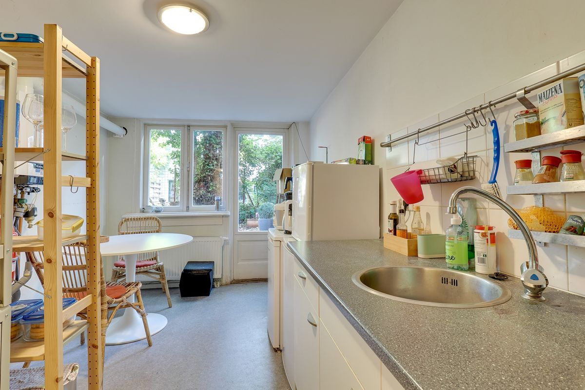 Met de gemeenschappelijke trap naar beneden, kom je in het souterrain, dat op tuinhoogte ligt. Via de overloop kom je binnen in het appartement aan de achterzijde, met een gezellige praktische woonkamer en via de kamer on suite deuren in de aangrenzende slaap/werkkamer. De slaap/werkkamer geeft direct toegang tot de aangrenzende ruime tuin, met leuk beschut terras en boarders. Je woont midden in het groen. De deur van je slaapvertrek, kan je hier nachts open zetten, want je woont hier veilig. De keuken is ruim van omzet en compleet incl. eettafel. De badkamer is voorzien is van een douche, wc en wastafel. Aan het eind van de overloop in de berging, staat ook de gedeelde wasmachine.