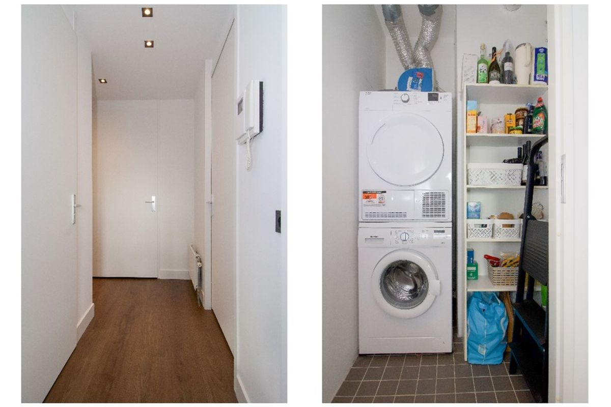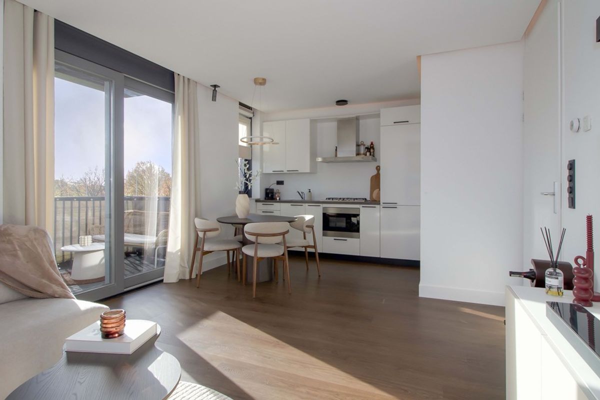De lichte woonkamer met een plafondhoogte van 2,80 meter biedt ruimte voor een comfortabele zithoek en eethoek. De open keuken is praktisch ingedeeld en voorzien van inbouwapparatuur. Vanuit de woonkamer is er toegang tot het balkon, waar je heerlijk buiten kunt zitten.