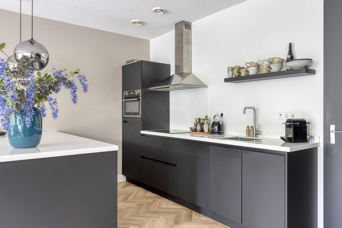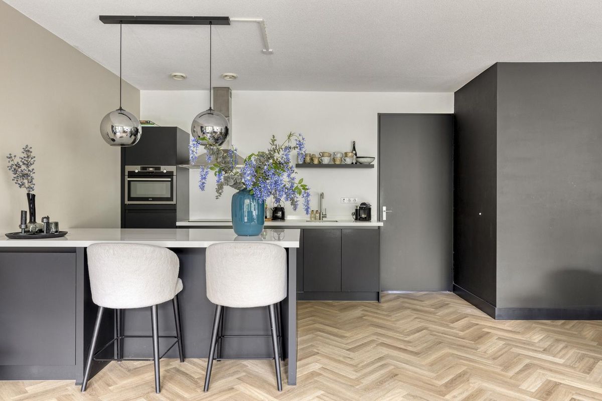 De moderne open keuken is uitgevoerd in een strakke opstelling en voorzien van inbouwapparatuur zoals een kookplaat met afzuiging, combi-oven, vaatwasser, koelkast en vriezer. Ideaal voor de kookliefhebber! Ook aan kastruimte is er geen gebrek in deze keuken.