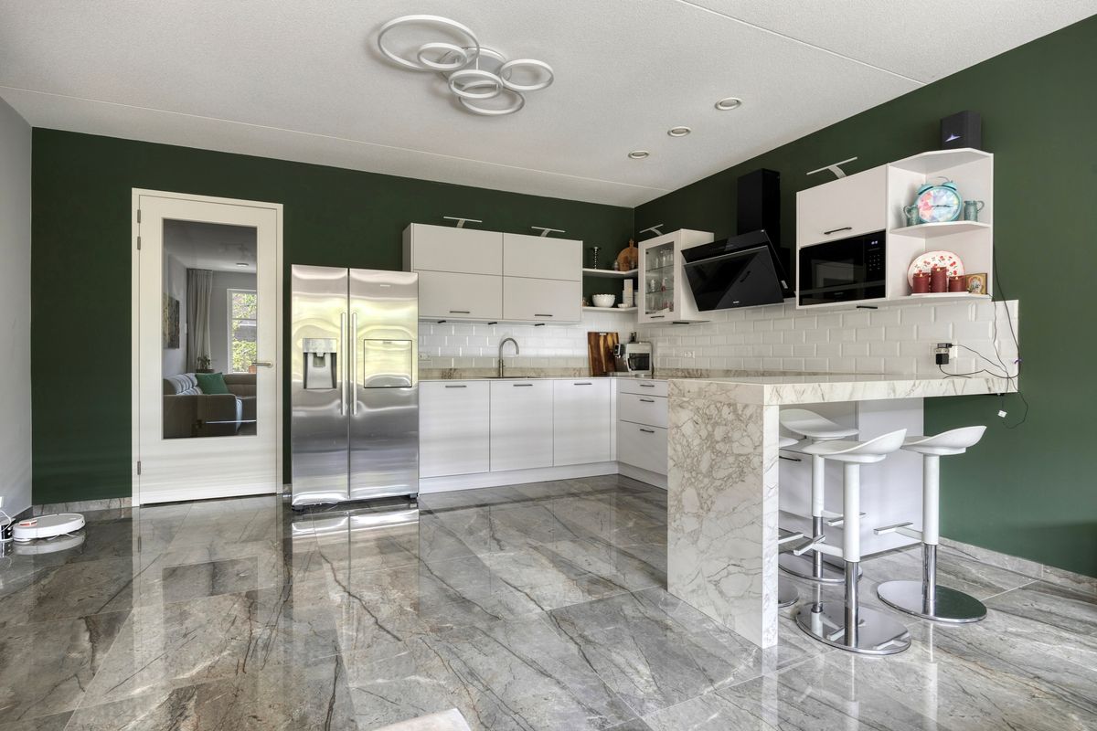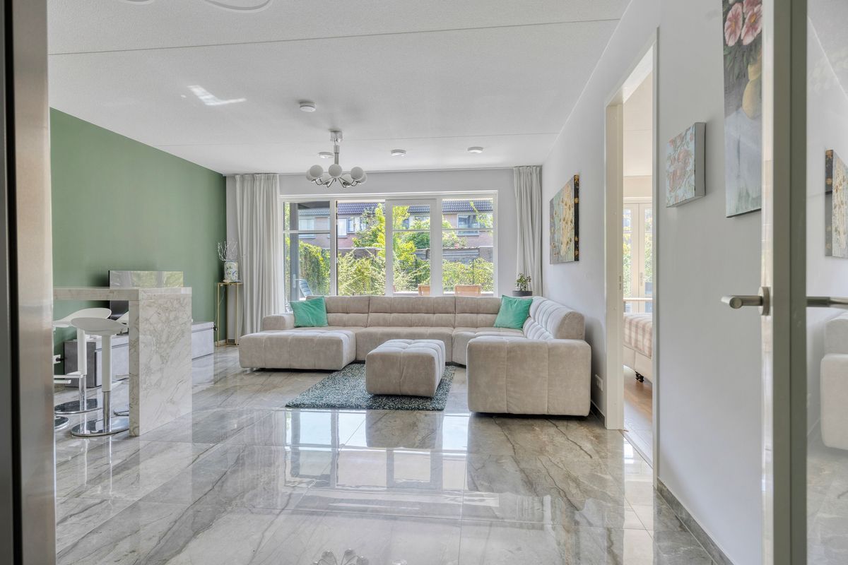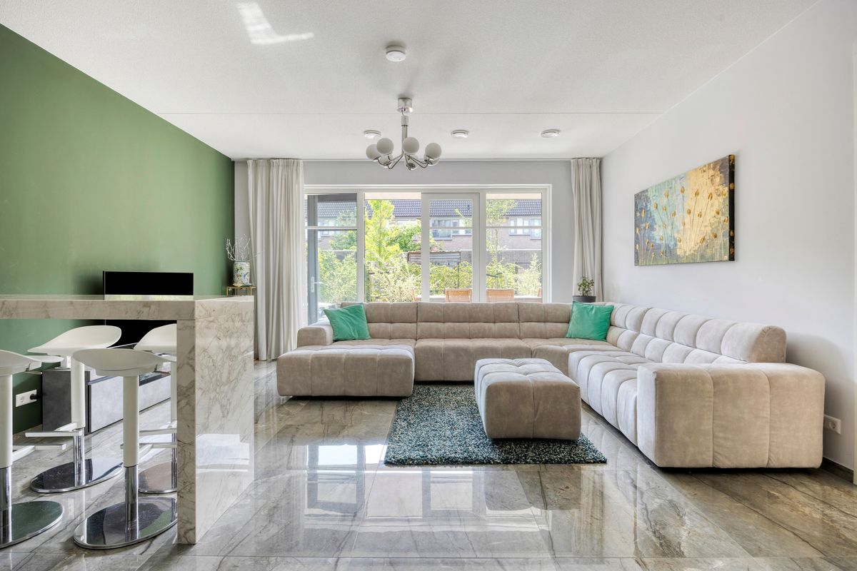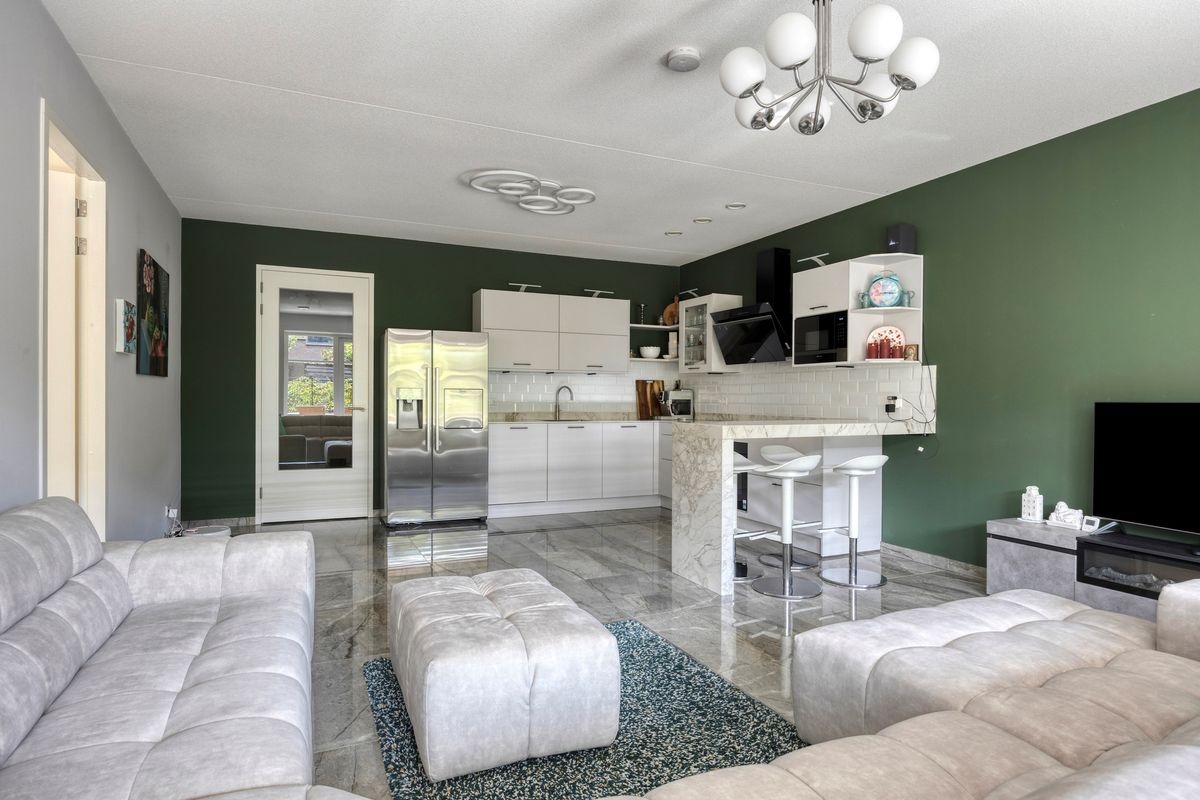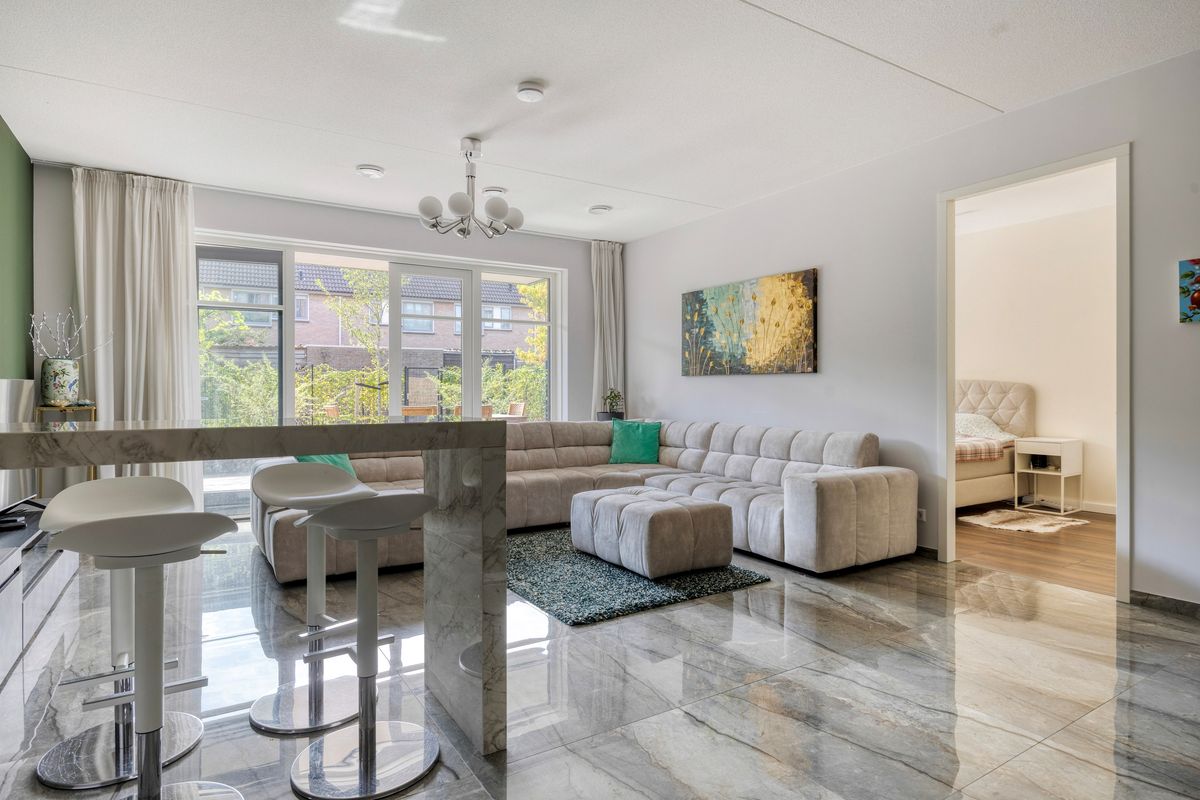 De lichte en ruime woonkamer met open keuken bevindt zich aan de achterzijde van de woning. Deze geeft toegang tot de ruime tuin (ca. 104m2) met terras, gelegen op het zuidwesten. De open keuken is compleet uitgerust en luxe afgewerkt.