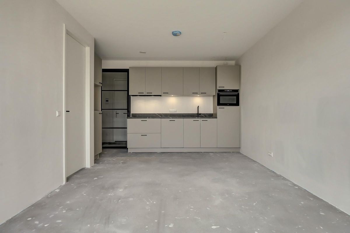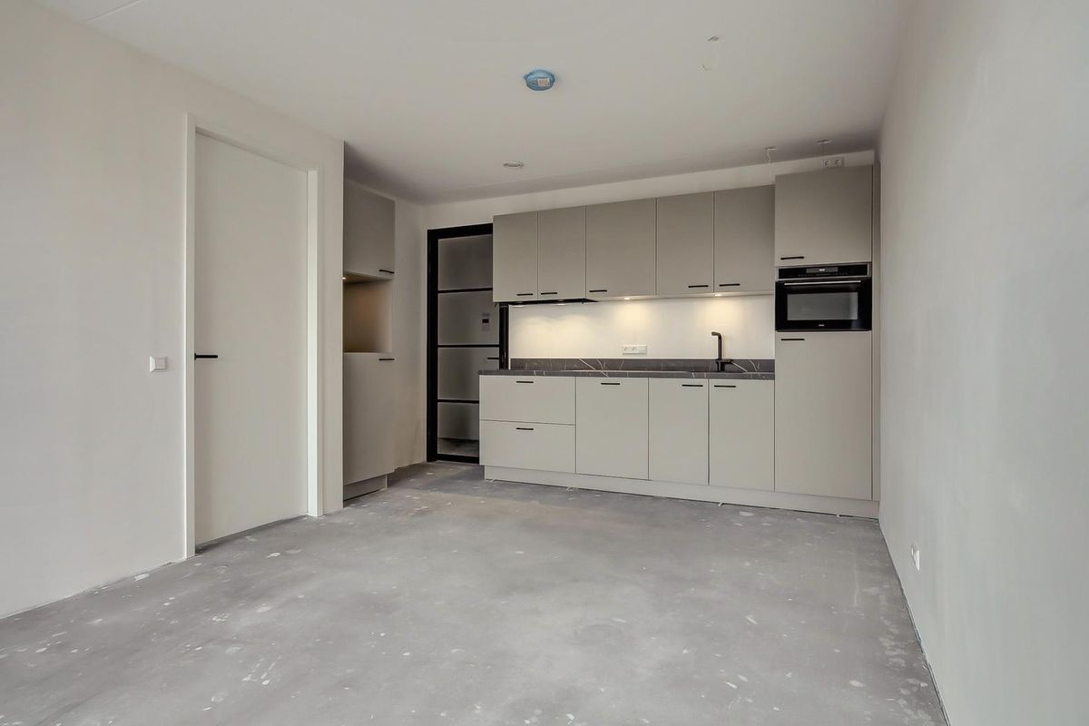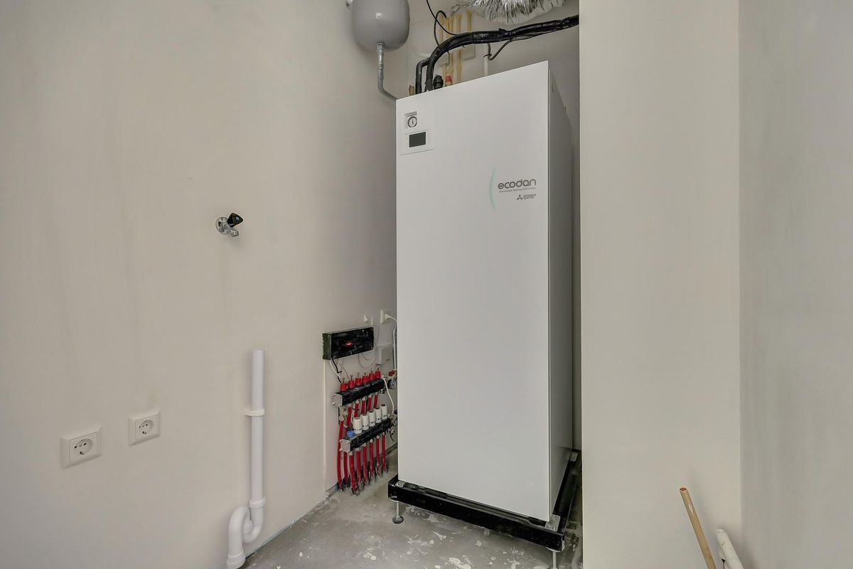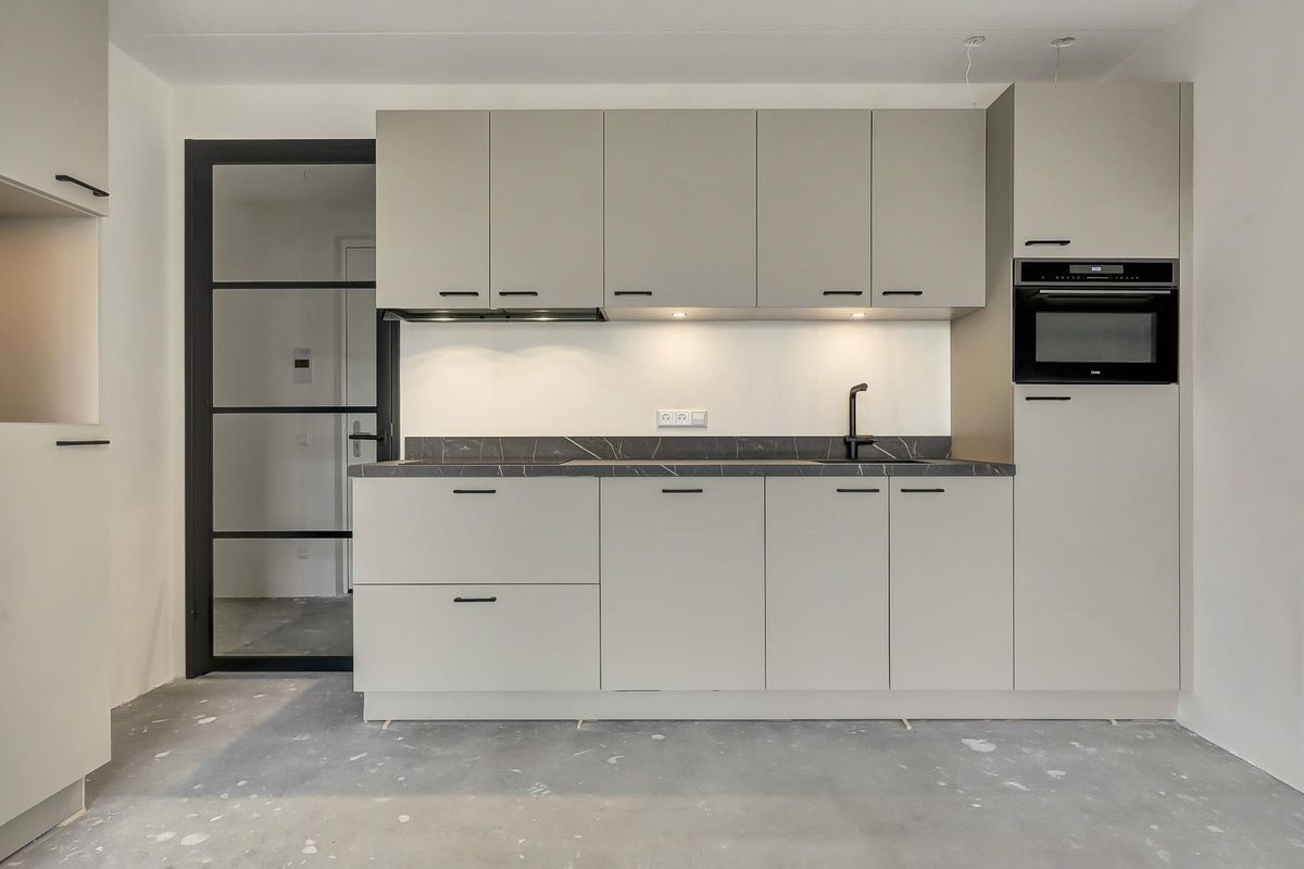 Aangrenzend bevindt zich de open keuken met een moderne uitstraling. De keuken is voorzien van strakke fronten in een rustige kleurstelling en een strak werkblad met marmerlook. Er is een inductiekookplaat, afzuigkap, vaatwasser, combi-oven en koelkast aanwezig, alles mooi geïntegreerd en direct klaar voor gebruik. Achter de keuken ligt een handige bijkeuken/berging met aansluiting voor wasapparatuur en de verwarmings-installatie.