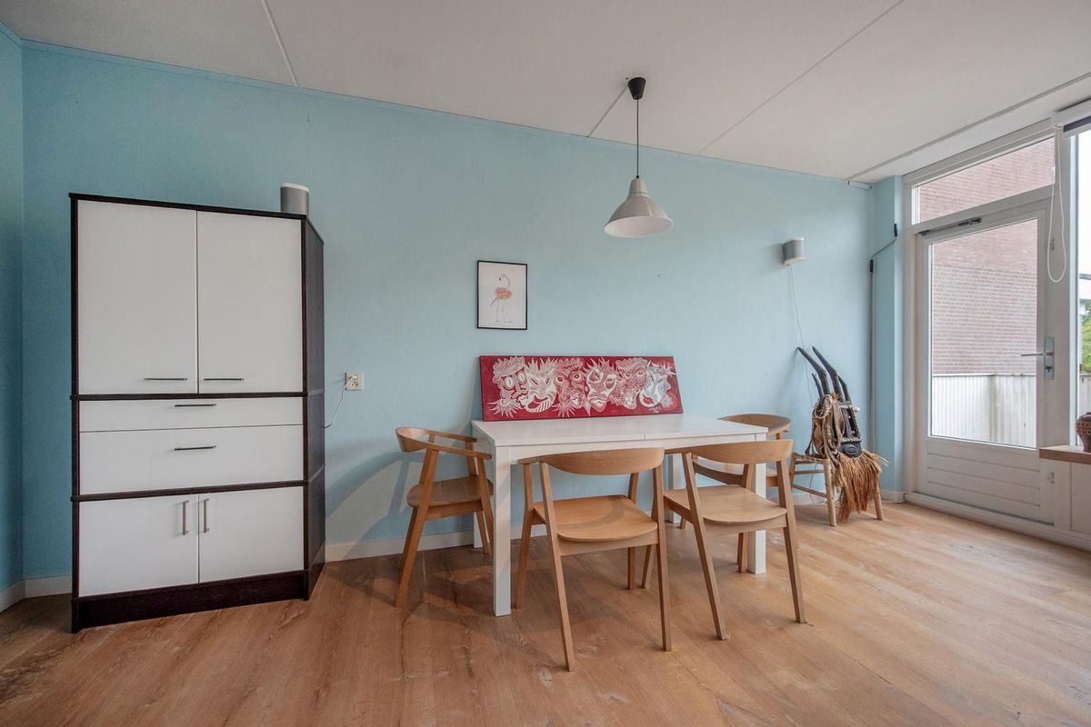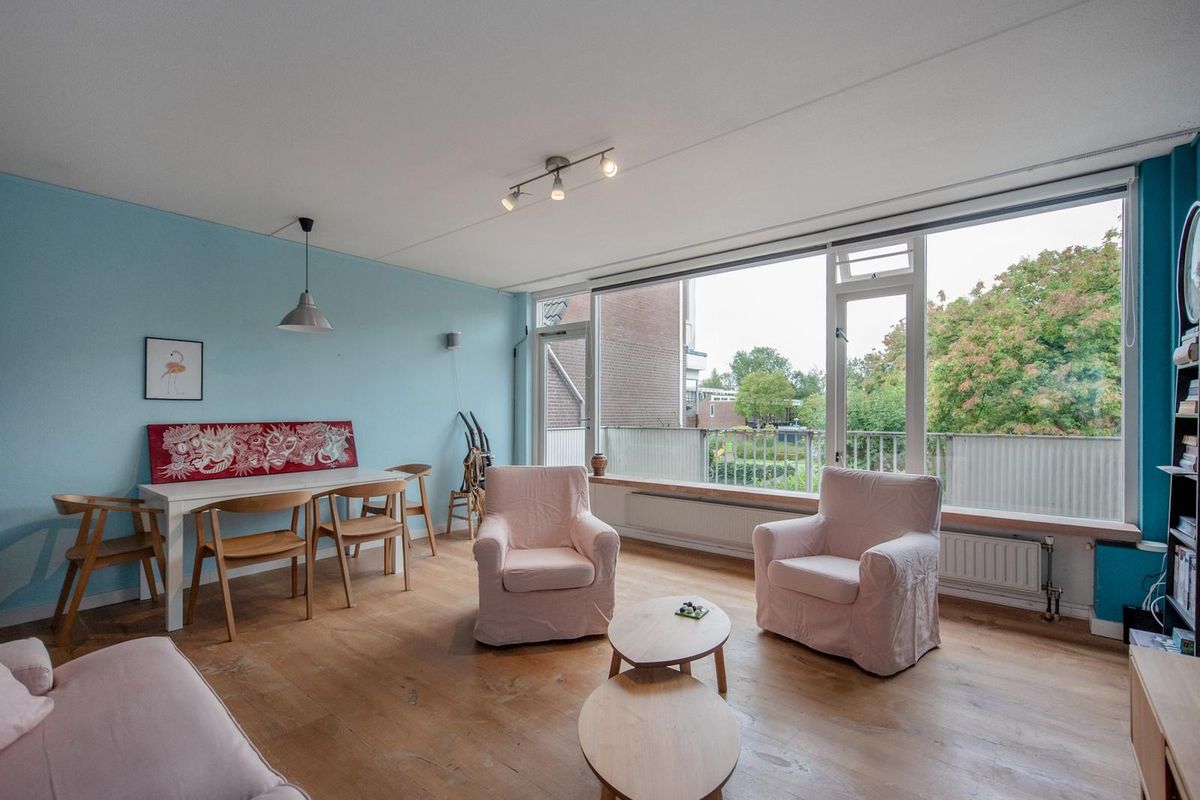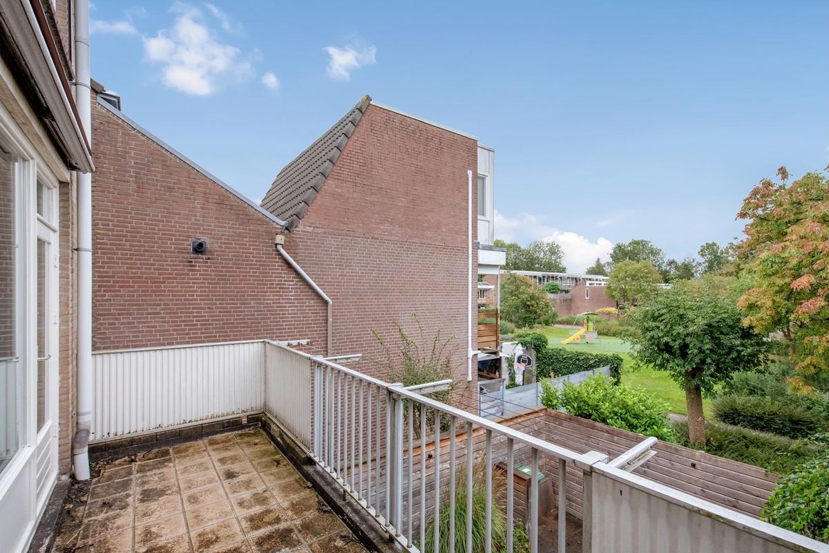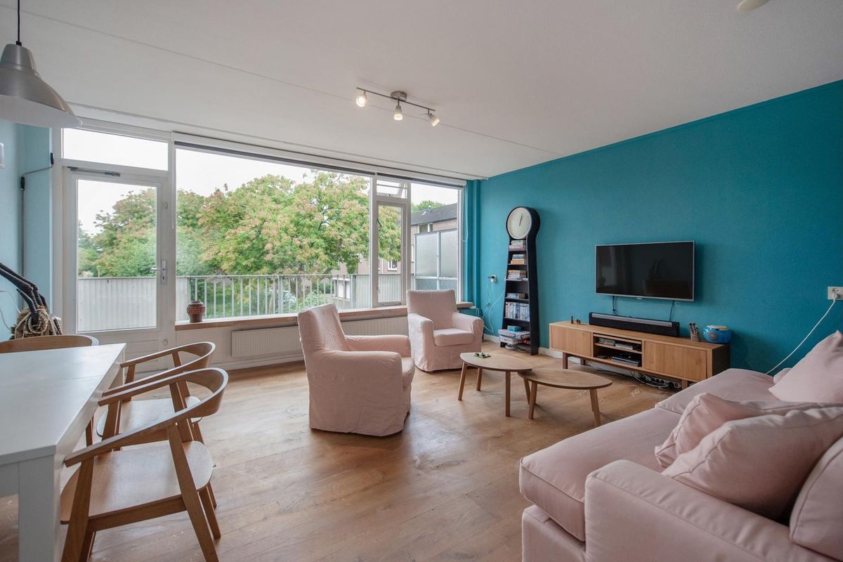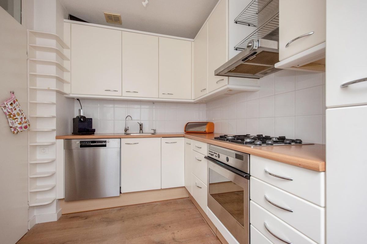 1e etage: Overloop met toilet, CV-kast en deur naar de woonkamer. De lichte woonkamer is balkongericht en heeft ook een houten vloer. Er is een deur naar het balkon, dat net als de tuin op het zuidoosten ligt. De dichte keuken heeft een nette keukenopstelling met een ingebouwde koelkast, vaatwasmachine (2025), 4-pits gaskookplaat, combi-oven en afzuigkap. De deur in de keuken geeft toegang tot het 2e balkon.