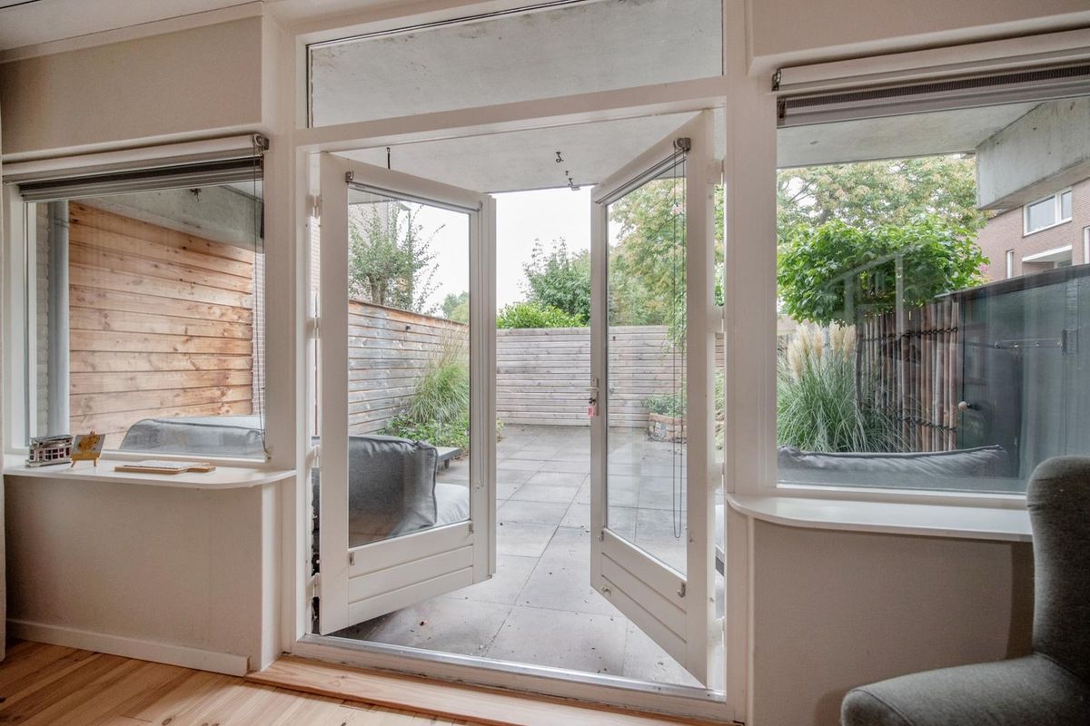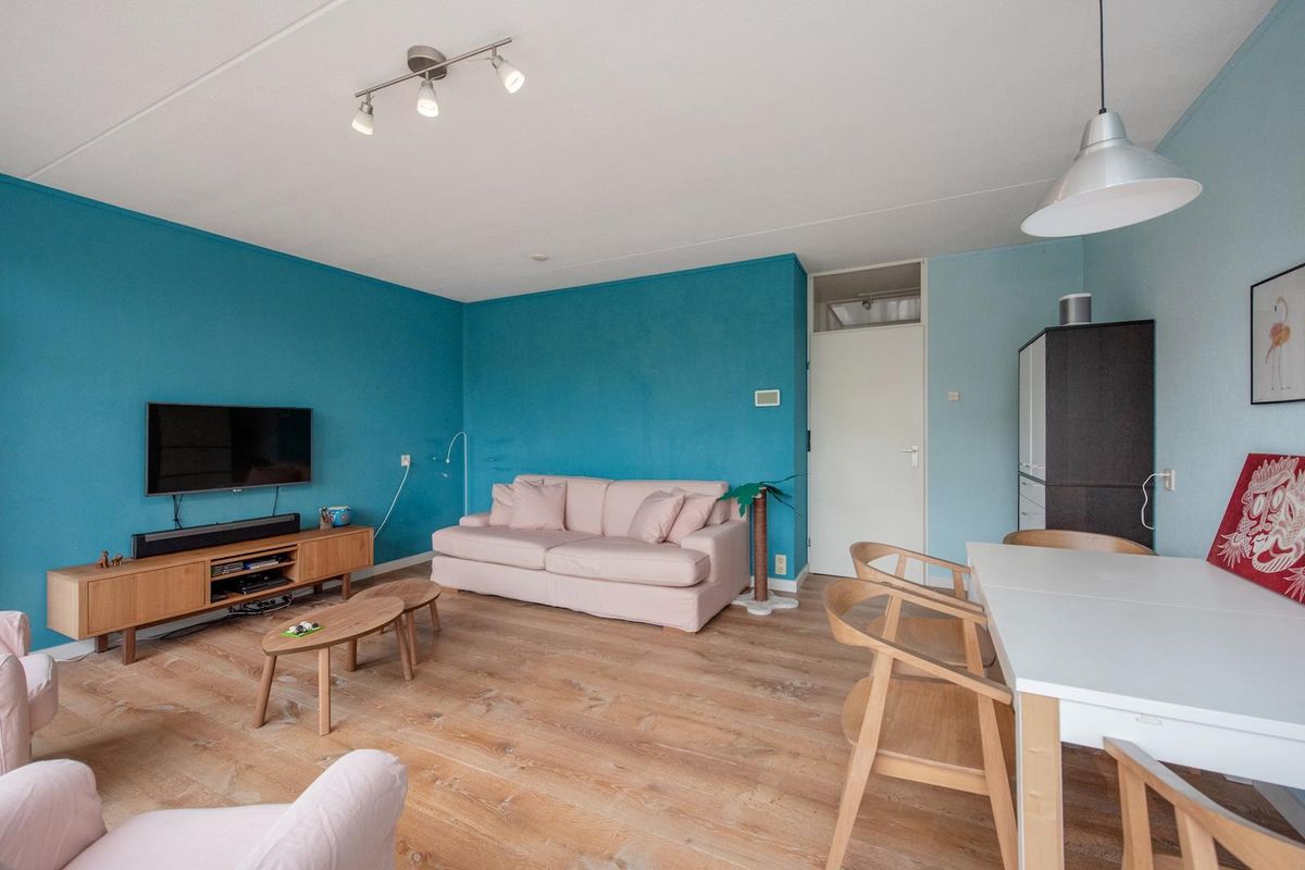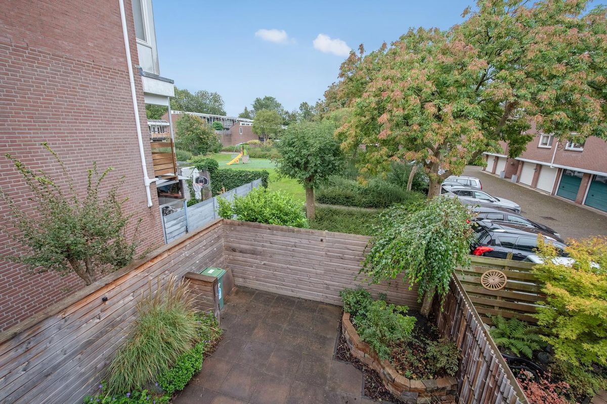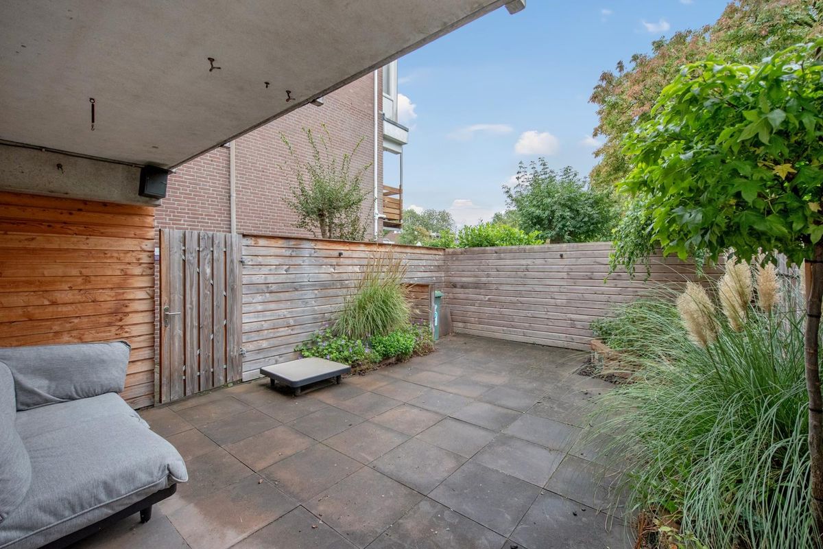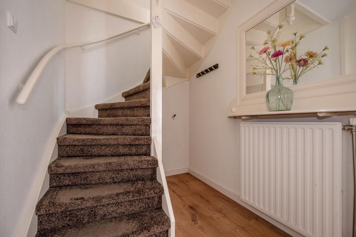 1e etage: Overloop met toilet, CV-kast en deur naar de woonkamer. De lichte woonkamer is balkongericht en heeft ook een houten vloer. Er is een deur naar het balkon, dat net als de tuin op het zuidoosten ligt. De dichte keuken heeft een nette keukenopstelling met een ingebouwde koelkast, vaatwasmachine (2025), 4-pits gaskookplaat, combi-oven en afzuigkap. De deur in de keuken geeft toegang tot het 2e balkon.