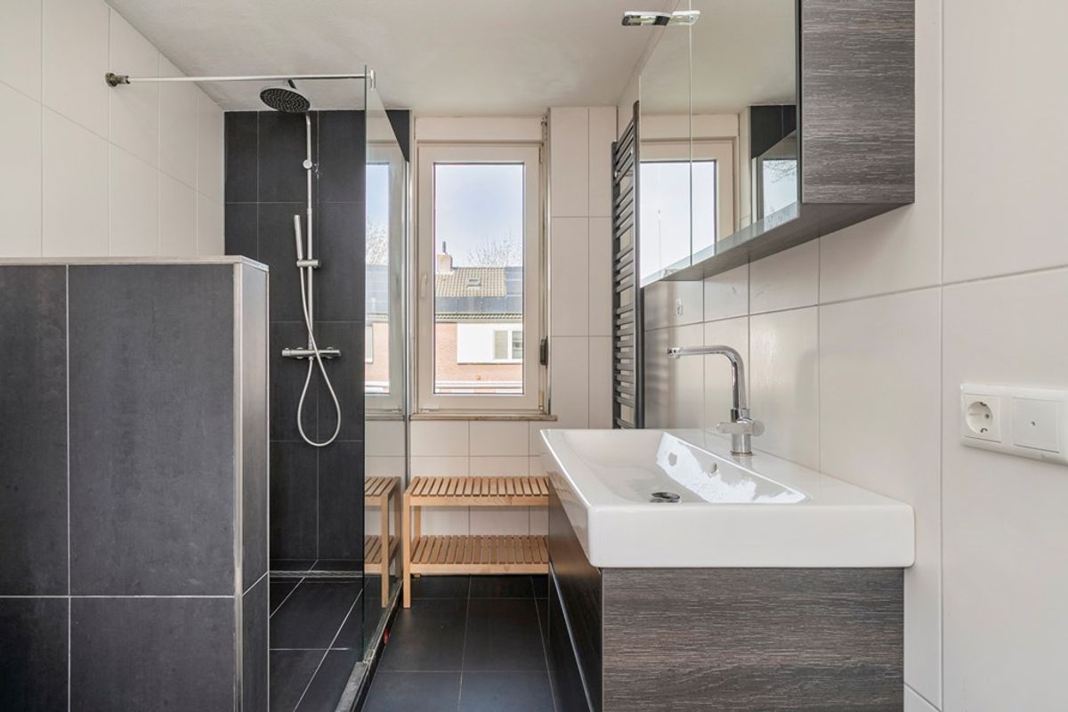 Overloop, badkamer met inloopdouche, toilet, wastafel met opbergmeubel en designradiator.