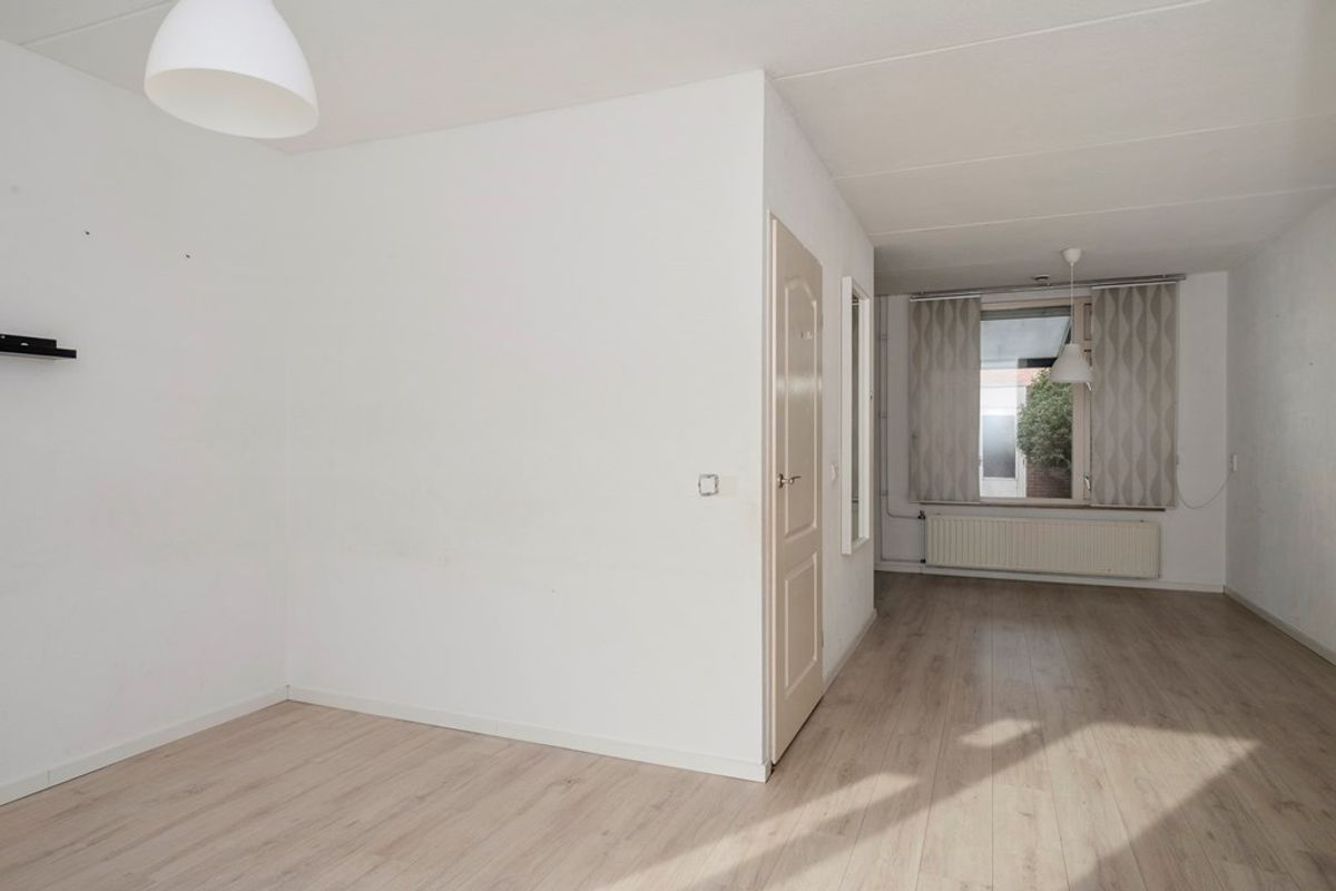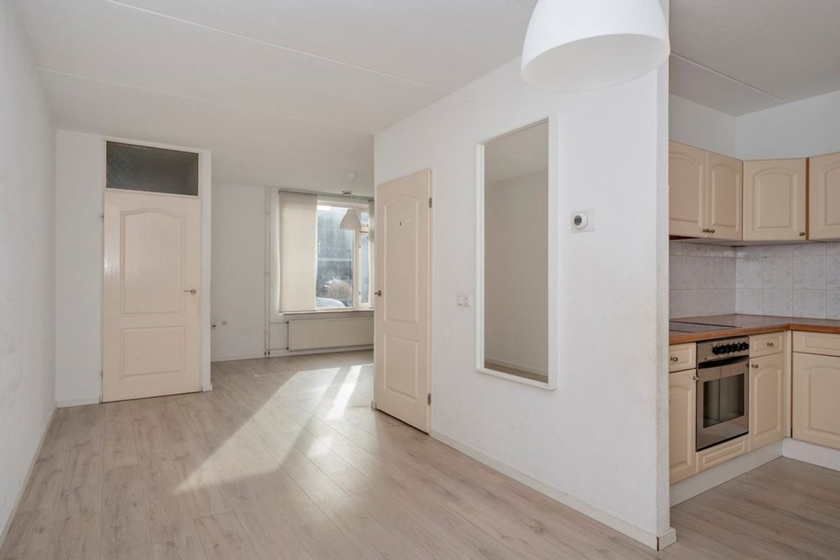 Lichte woonkamer met toegang tot de halfopen keuken.