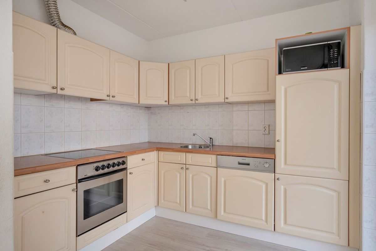 Eenvoudige keuken welke voorzien is van de volgende inbouwapparatuur: keramische kookplaat, afzuigkap, oven, magnetron, vaatwasser en een koelkast.