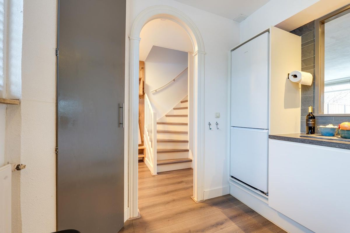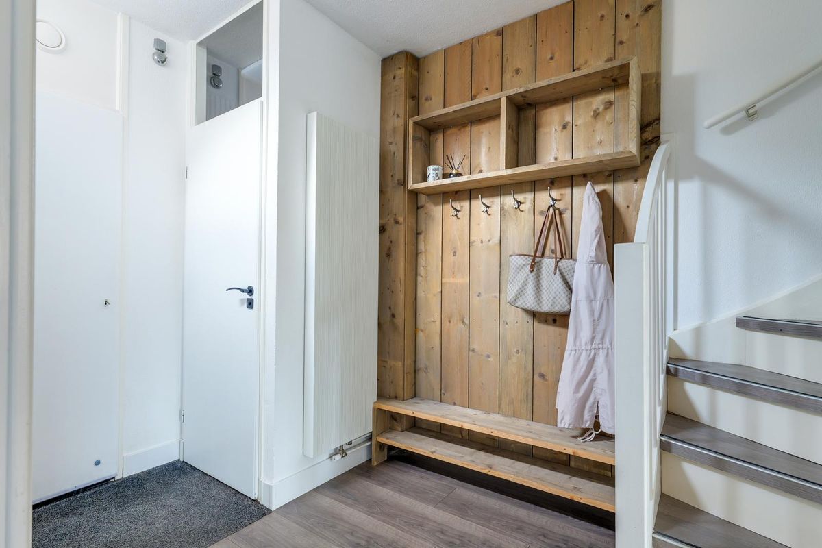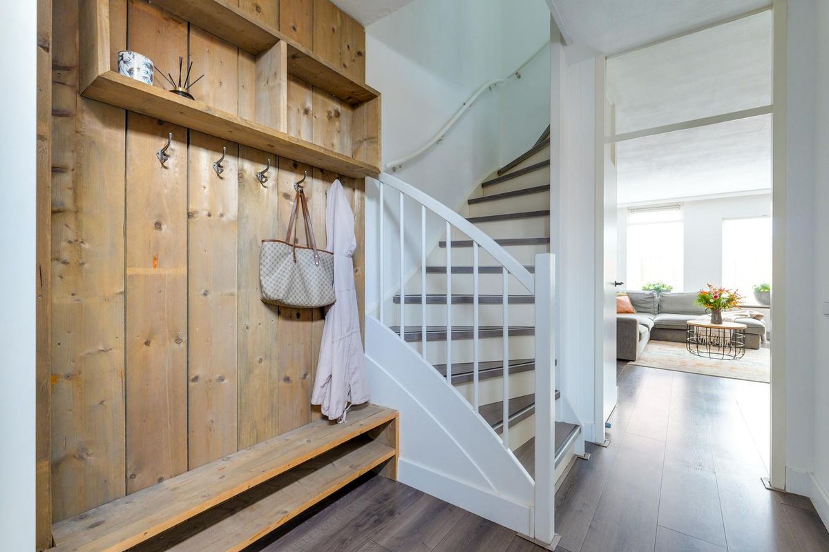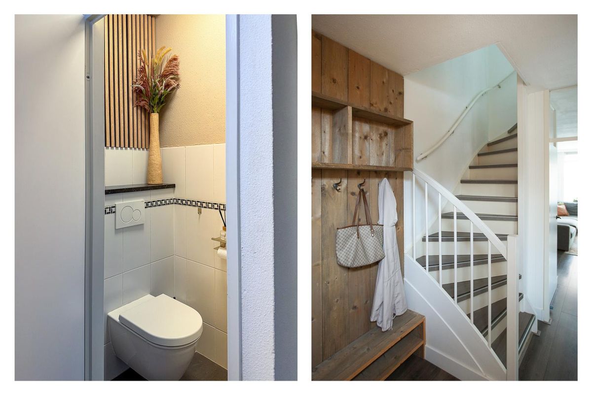De hal is niet alleen heel ruim en licht, maar ook heel sfeervol. De trap is gerenoveerd en de maatwerk garderobe van steigerhout heeft een fraaie uitstraling. Naast de meterkast is de toiletruimte, ingedeeld met een wandcloset en een fonteintje.