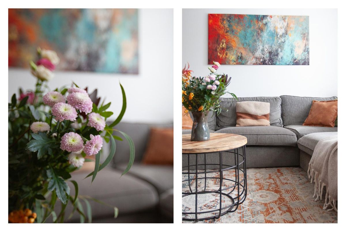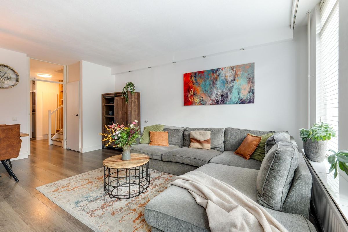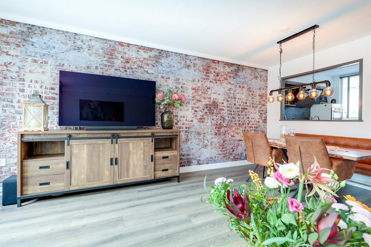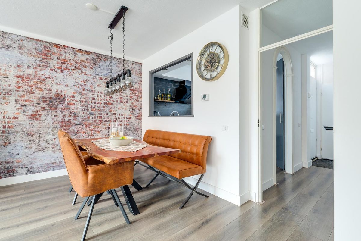 Grote ramen aan de zuidkant zorgen voor veel lichtinval in de woon-/eetkamer, met een ruim zitgedeelte en genoeg plek voor de eettafel. Fraaie elementen zijn het strak afgewerkte plafond, de koof met inbouwverlichting en het behang op de lange wand.