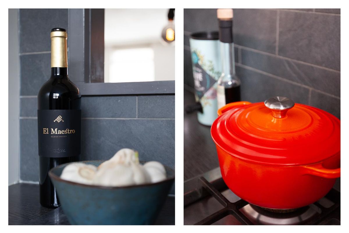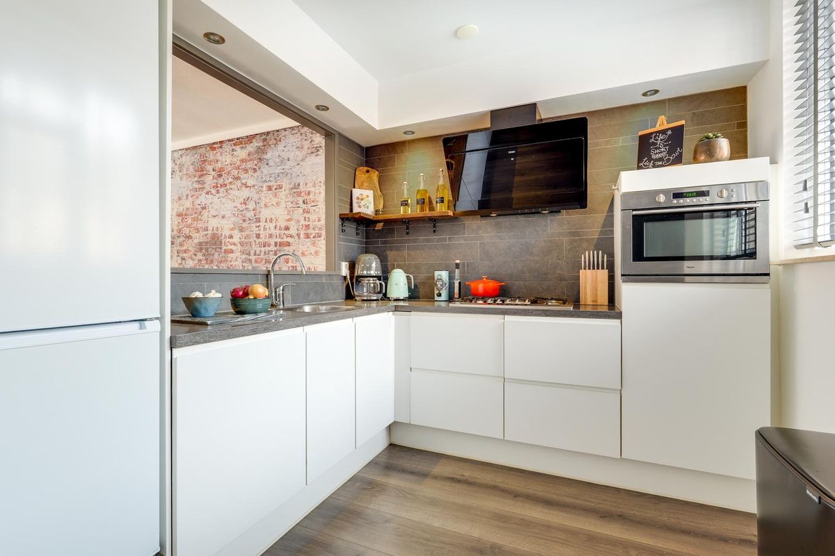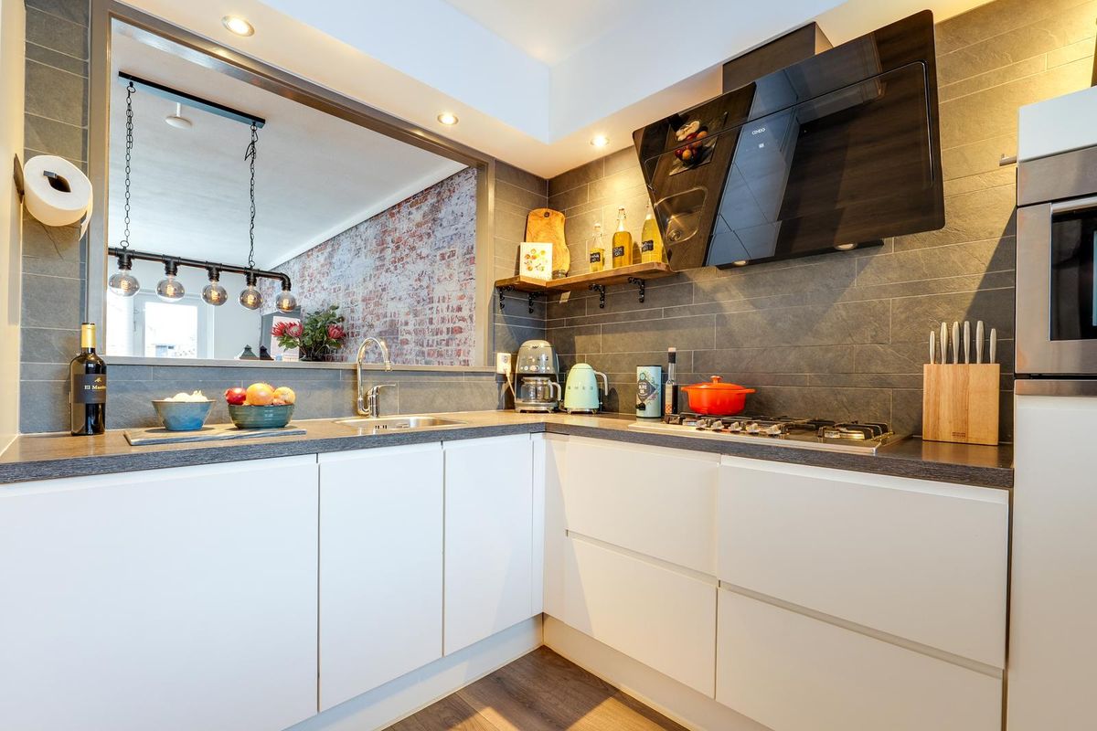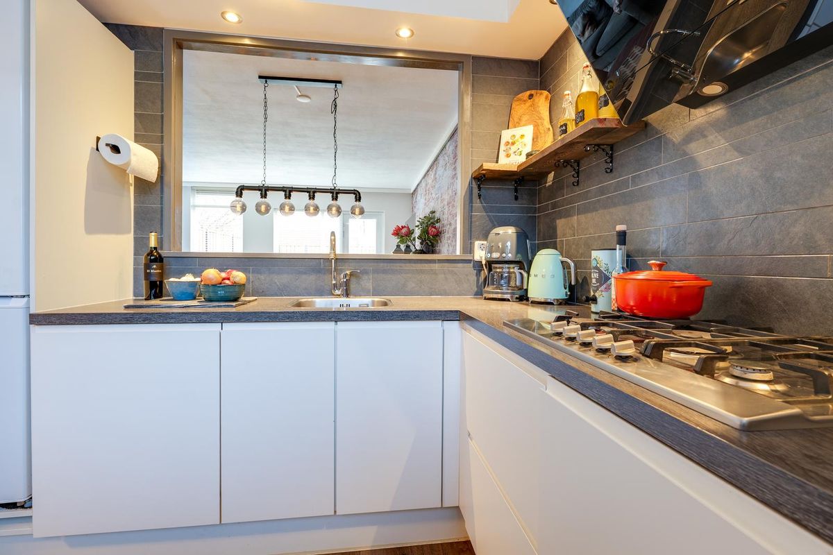 Aan de voorzijde is de keuken, die niet open maar ook niet geheel dicht is. Een groot raam zonder glas zorgt voor een mooie verbinding met het eetgedeelte. De lichte hoekopstelling is uitgevoerd met een grijs aanrechtblad, goed passend bij de tegels op de wand. De 5-pits gaskookplaat, afzuigkap, vaatwasser en combi-oven zijn ingebouwd. Een hoge, open kast biedt plek om een koel-/vriescombinatie neer te zetten.