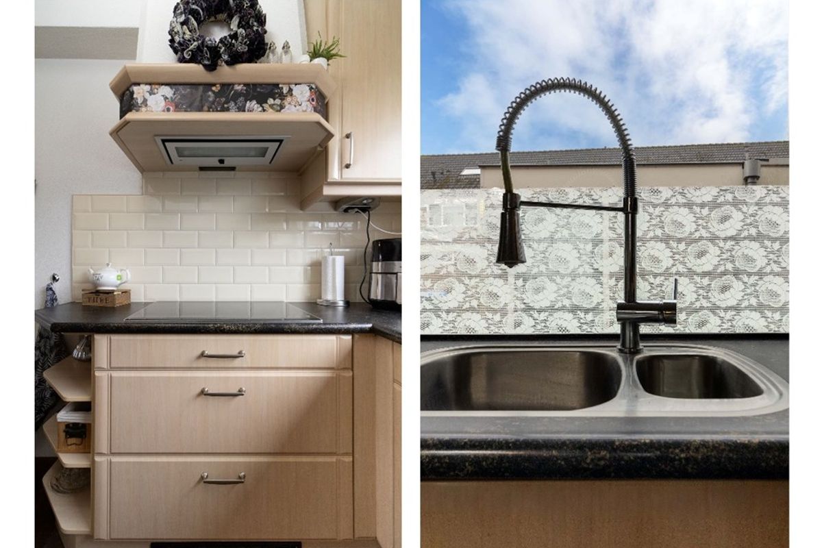 Aan de voorzijde bevindt zich de open keuken, geplaatst in een praktische opstelling met voldoende werk- en bergruimte. Vanuit de woonkamer is tevens de achterdeur bereikbaar, met directe toegang tot de tuin.