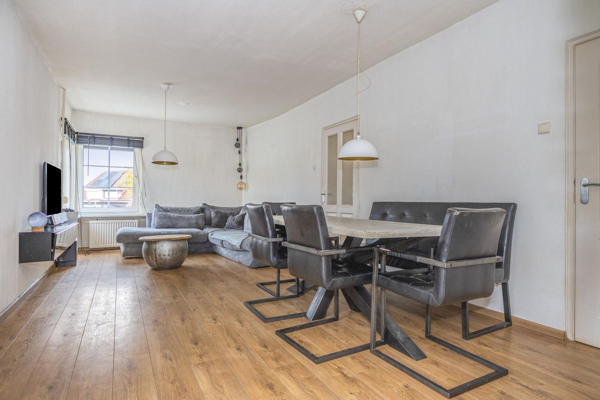 Ruime woonkamer (7,10 x 3,48 m) met laminaatvloer.