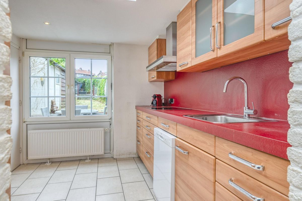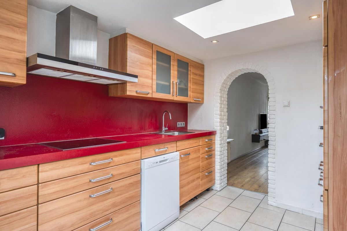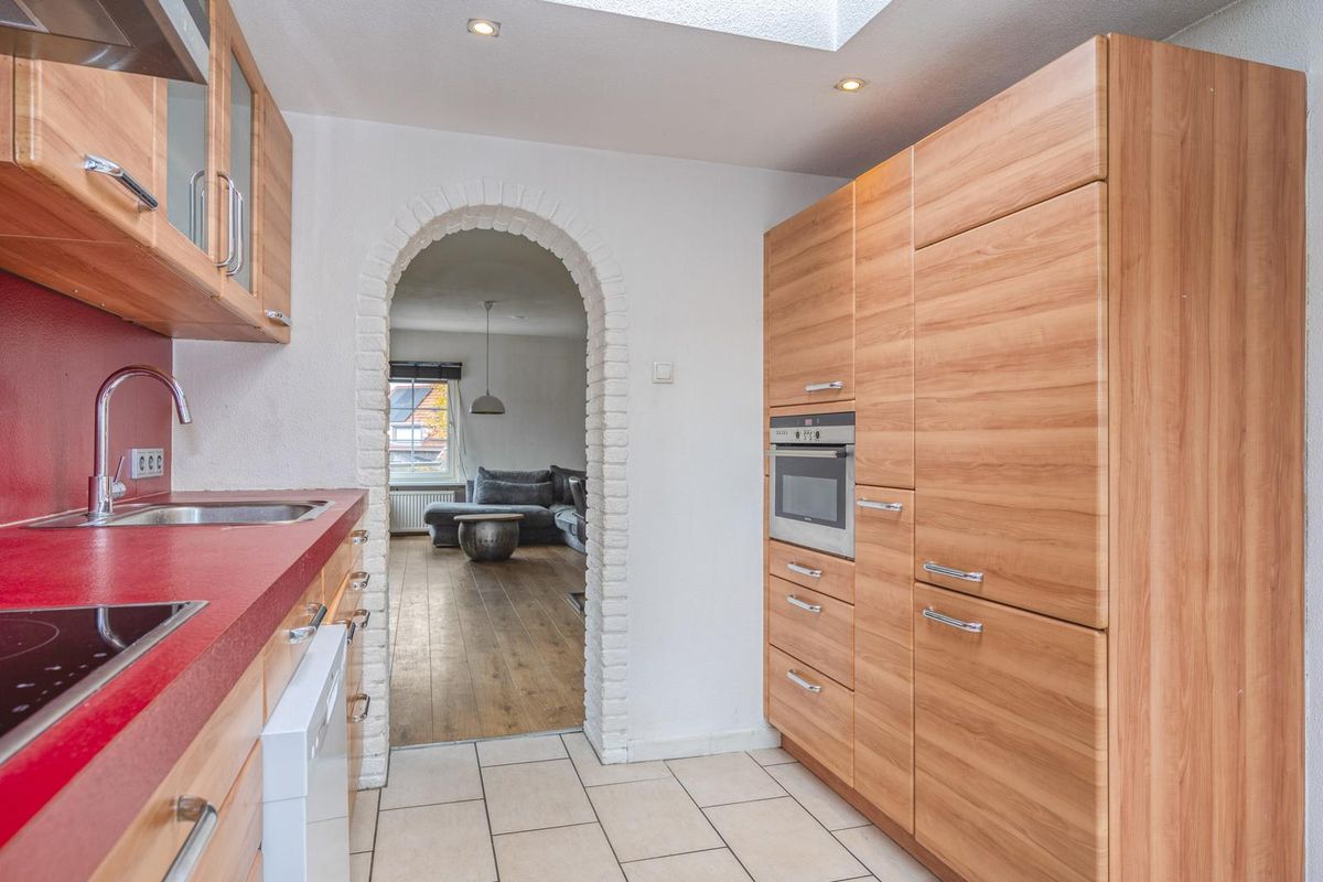 Halfopen keuken (3,22 x 2,62 m) met tegelvloer en een keukencombinatie uit 2015, compleet met inbouwapparatuur. Portaal met toegang tot de tuin.