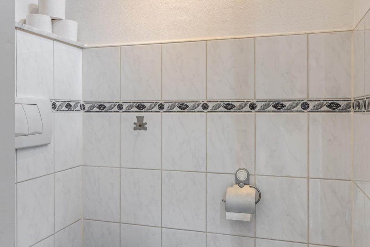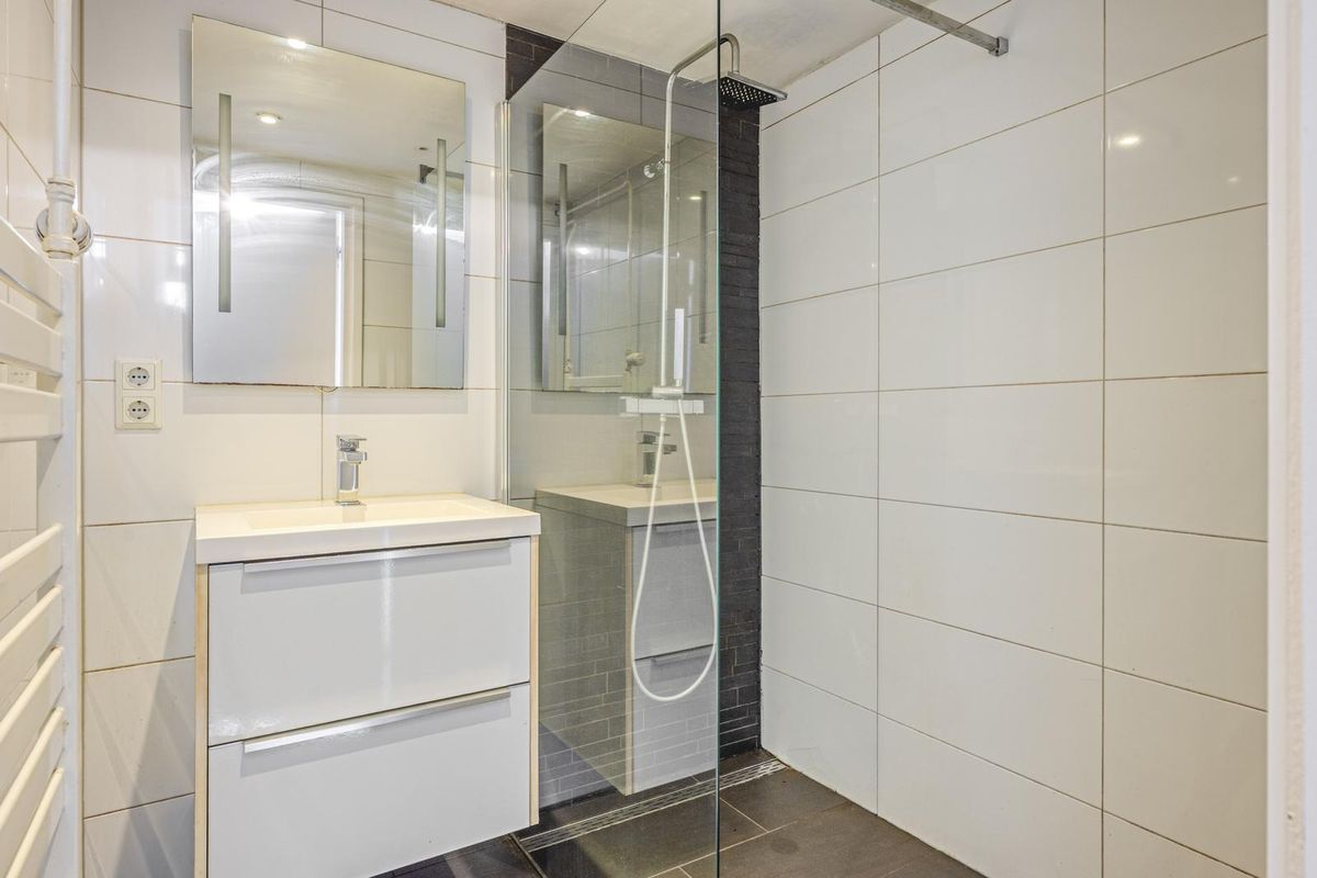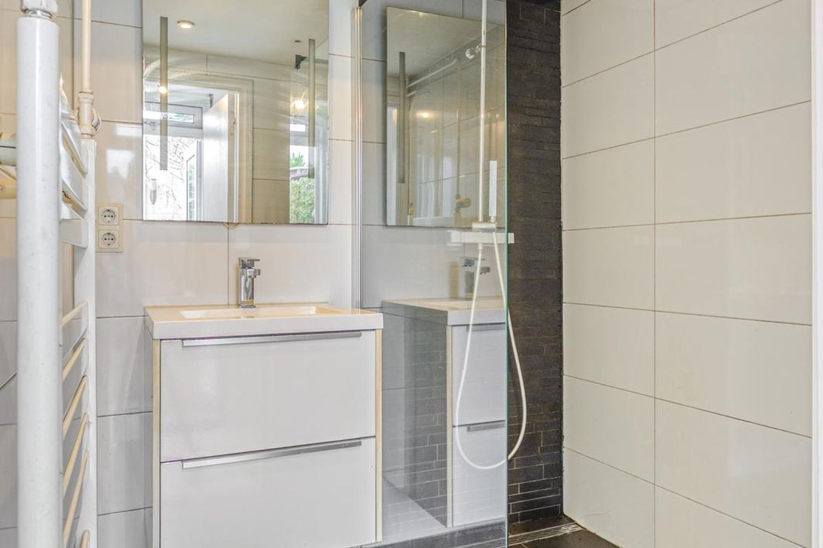 Verder op de begane grond: een halfhoog betegeld toilet en een moderne, volledig betegelde badkamer met inloopdouche en een strak wastafelmeubel.