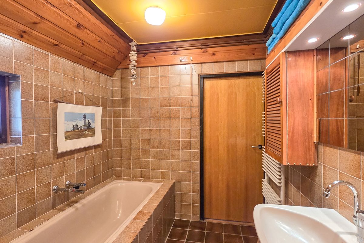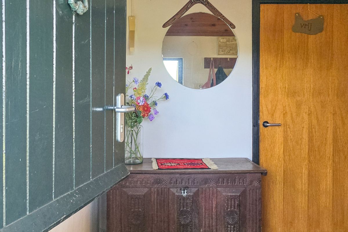 Het achterhuis, gelegen op het westen, beschikt over een royale woonkamer met een plafondhoogte van circa 4,80 meter, waarin de authentieke gebinten en karakteristieke details meteen opvallen. Een 'skúntsje' aan de zuidgevel versterkt het traditionele Terschellinger karakter. Vanuit de woonkamer bereikt u de keuken met eethoek, voorzien van een praktische berging/bijkeuken en een doorgang naar het voorhuis. Op de begane grond bevinden zich daarnaast een slaapkamer met badkamer en suite, die via een doorloop verbonden is met een separaat toilet, allen ook ruim van opzet. In het hart van de woonkamer leidt een trapopgang naar de verdieping, met een sfeervolle overloop en twee lichte slaapkamers met dakramen en inbouwkasten. Vanuit één van de kamers is via een vlizotrap de vliering bereikbaar, ideaal voor extra bergruimte. Het vrije uitzicht vanuit de tweede slaapkamer over de Waddendijk is bijzonder te noemen.