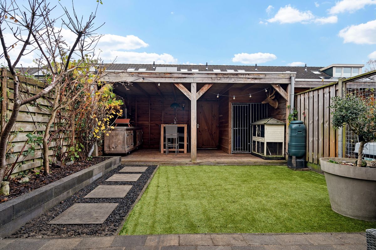 De achtertuin is een waar genot. Hier vind je een robuuste veranda waar je tot laat kunt genieten van warme zomeravonden – met het gezin of met vrienden. Daarnaast is er een achterom en extra bergruimte aanwezig.