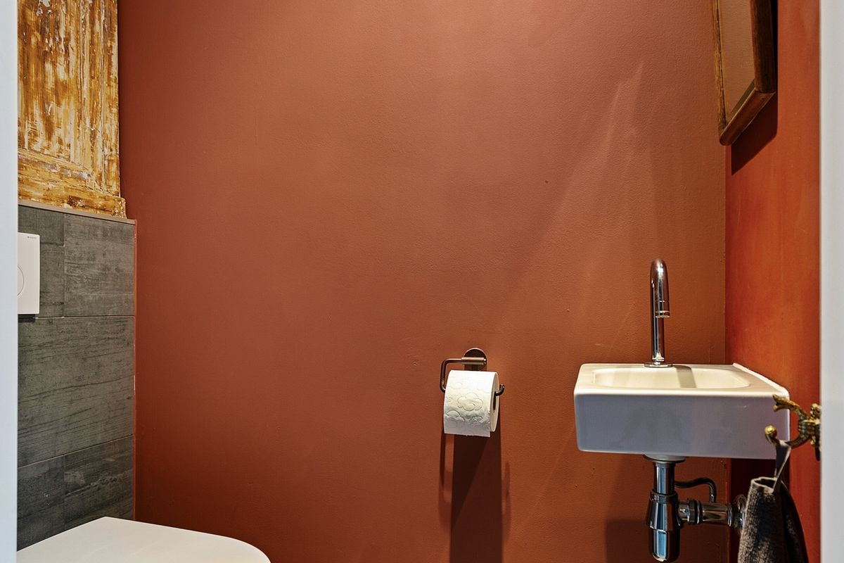 Via de entree bereik je de moderne toiletruimte met fontein. Vanuit de hal stap je de heerlijke woonkamer binnen — een ruimte waar je direct vrolijk van wordt. De stoere gietvloer geeft een warme en rustige uitstraling, terwijl de grote raampartijen zorgen voor veel lichtinval.