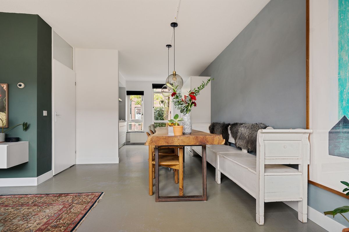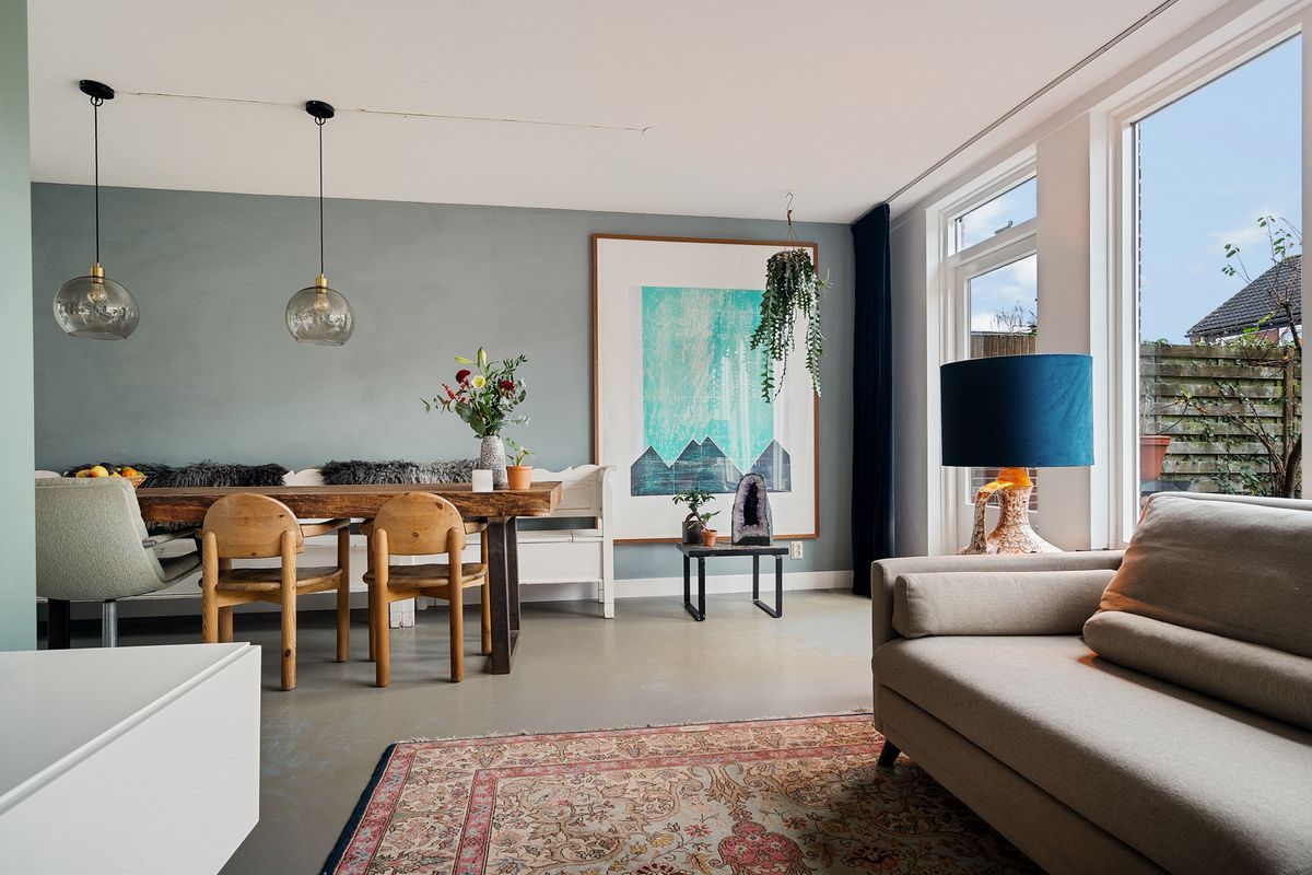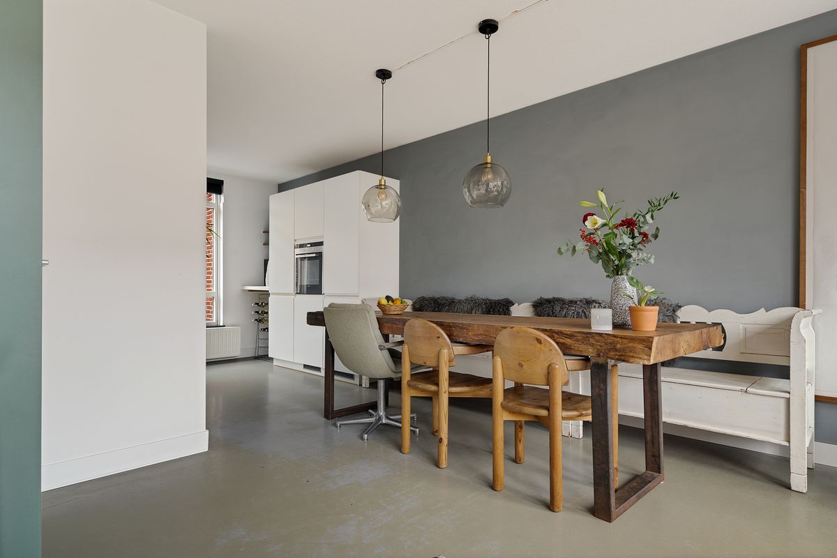 Aan de voorzijde bevindt zich de moderne keuken, uitgerust met diverse inbouwapparatuur en een extra kastenwand met grote oven. In het midden van de ruimte is een fijne eetopstelling, dé plek voor een uitgebreid diner of een gezellige borrel met vrienden. Aan de tuinzijde bevindt zich het sfeervolle zitgedeelte.