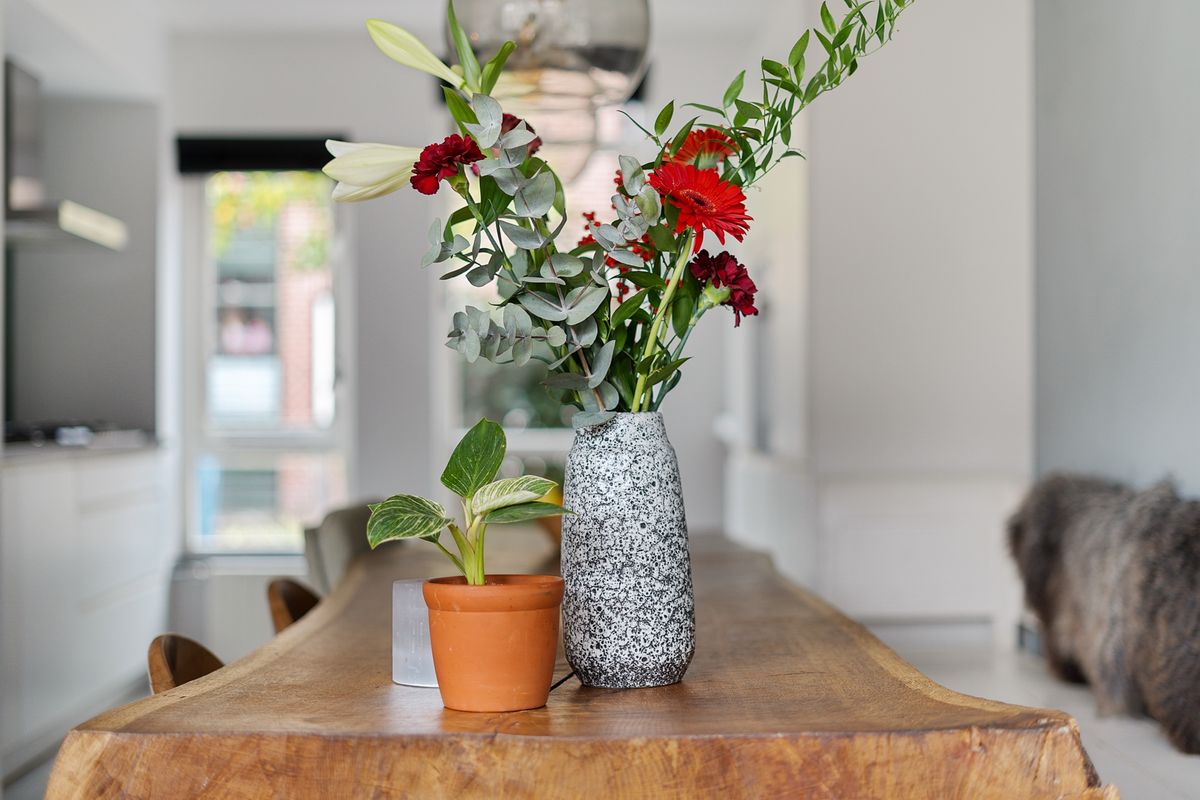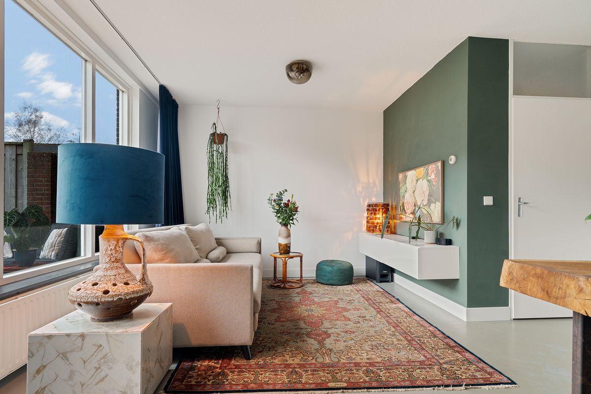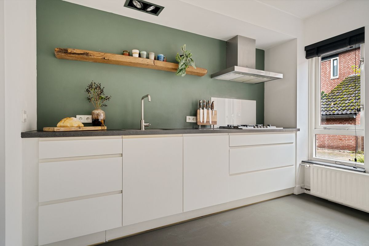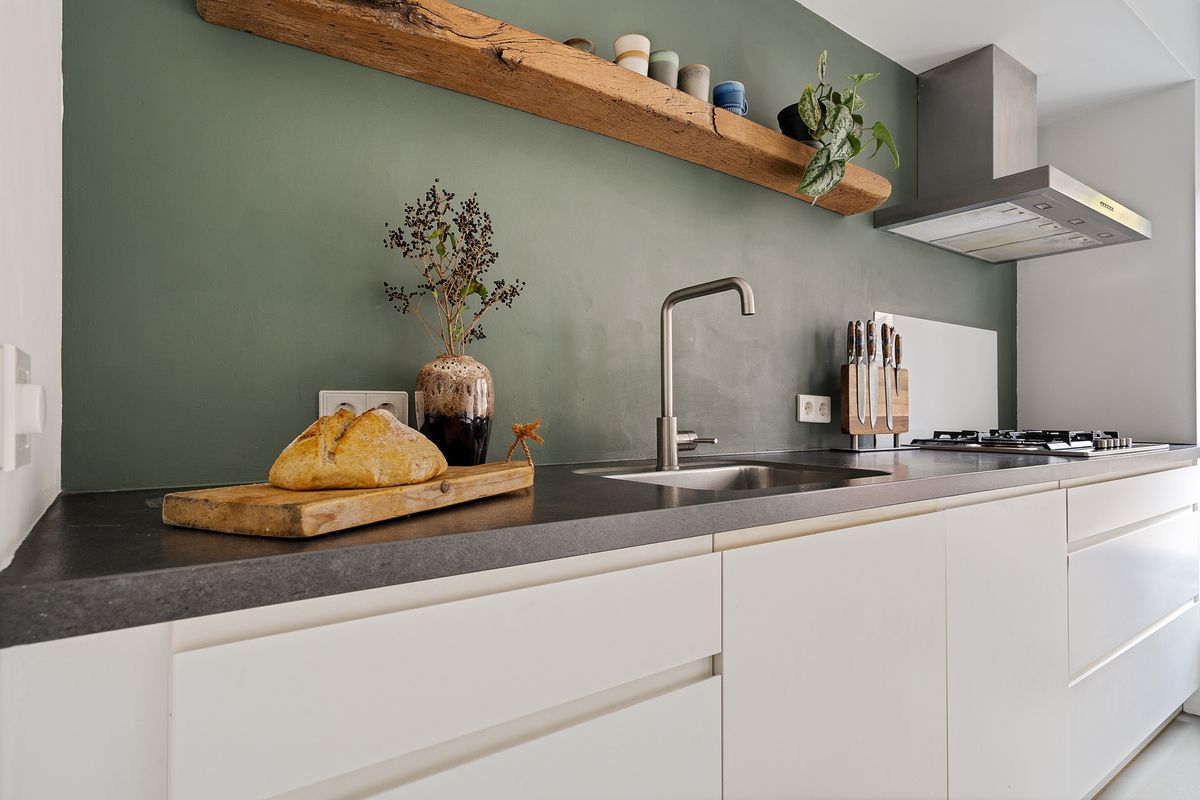 Aan de voorzijde bevindt zich de moderne keuken, uitgerust met diverse inbouwapparatuur en een extra kastenwand met grote oven. In het midden van de ruimte is een fijne eetopstelling, dé plek voor een uitgebreid diner of een gezellige borrel met vrienden. Aan de tuinzijde bevindt zich het sfeervolle zitgedeelte.
