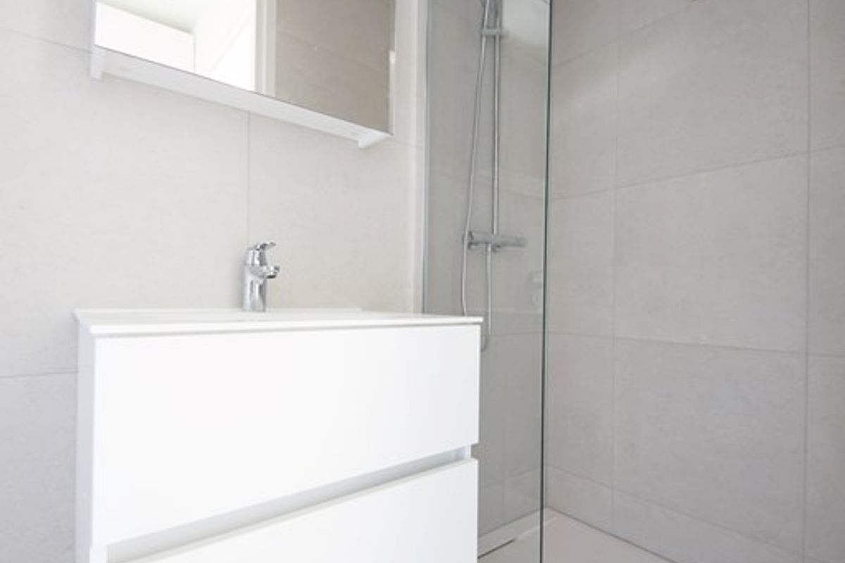 De volledig betegelde badkamer is voorzien van een ruime inloopdouche, een wastafel met meubel en toilet.