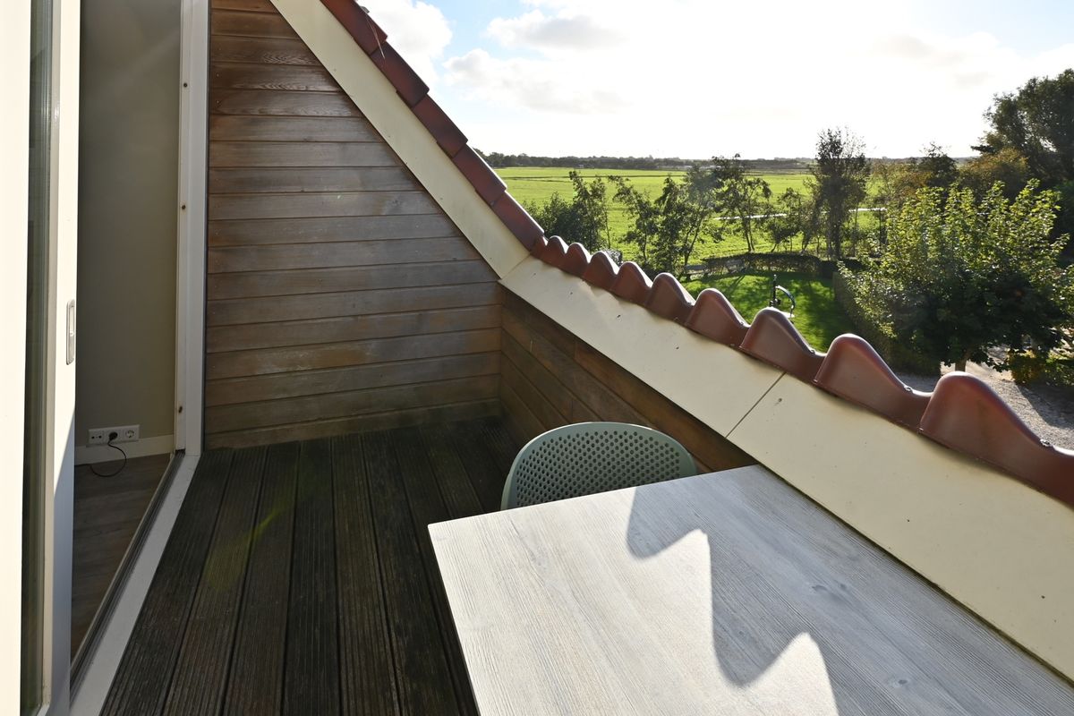Aan de zuidwestzijde ligt het zonnige balkon, voorzien van een beschut zitje en een weids uitzicht over de tuin en omliggende landerijen.