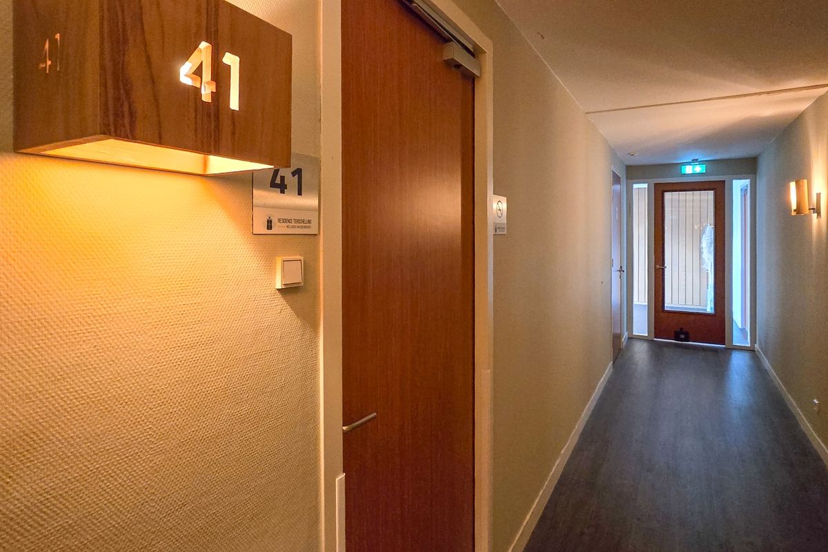 Bereikbaar per trap en lift, bevindt het appartement zich op de bovenste verdieping aan de zuid-westzijde van het complex. De hal biedt toegang tot de woonkamer met keuken, slaapkamer, badkamer en het separate toilet. Het inpandige balkon, met uitzicht over de binnentuin, is vanuit de woonkamer te bereiken.