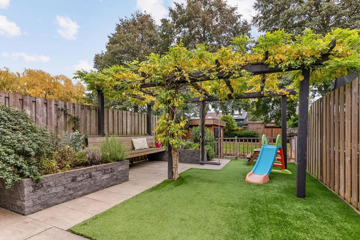 De voortuin is geheel bestraat en biedt directe toegang tot de inpandige berging. De achtertuin ligt ideaal op het zuidoosten en grenst aan het water. De tuin is fraai aangelegd met een groot terras, groene borders, kunstgras en een pergola die voor natuurlijke schaduw zorgt. Achter een laag hek bevindt zich een extra stukje tuin dat grenst aan de singel. Dit deel is vormgegeven als houten vlonder en bereikbaar via een klein trapje, waardoor je dicht bij het water kunt zitten terwijl de tuin toch veilig is afgesloten. Achterin staat een houten berging/tuinhuisje voor extra opbergruimte.