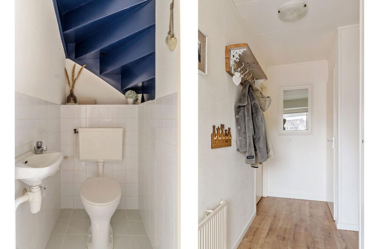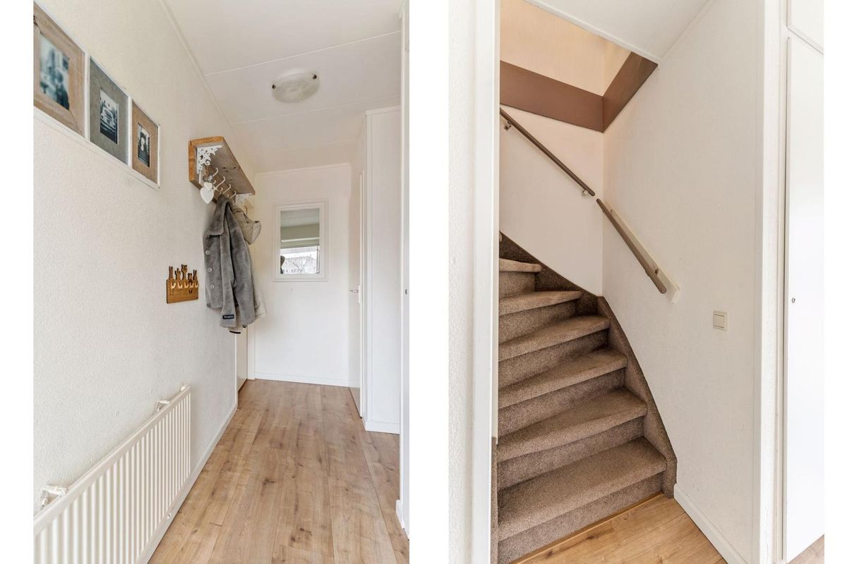 De hal biedt toegang tot de meterkast, de inpandige berging, de toiletruimte en de trap naar de verdieping. De inpandige berging is zowel van binnen als van buiten bereikbaar en biedt ruimte voor de wasmachine en droger, wat het dagelijkse gebruik erg praktisch maakt.