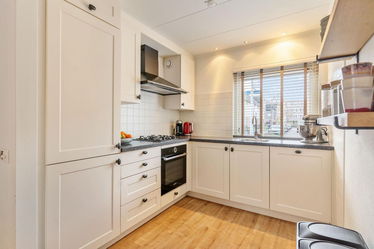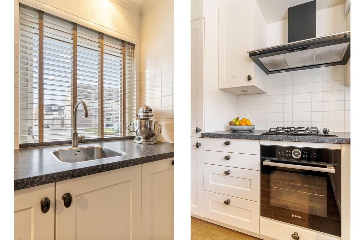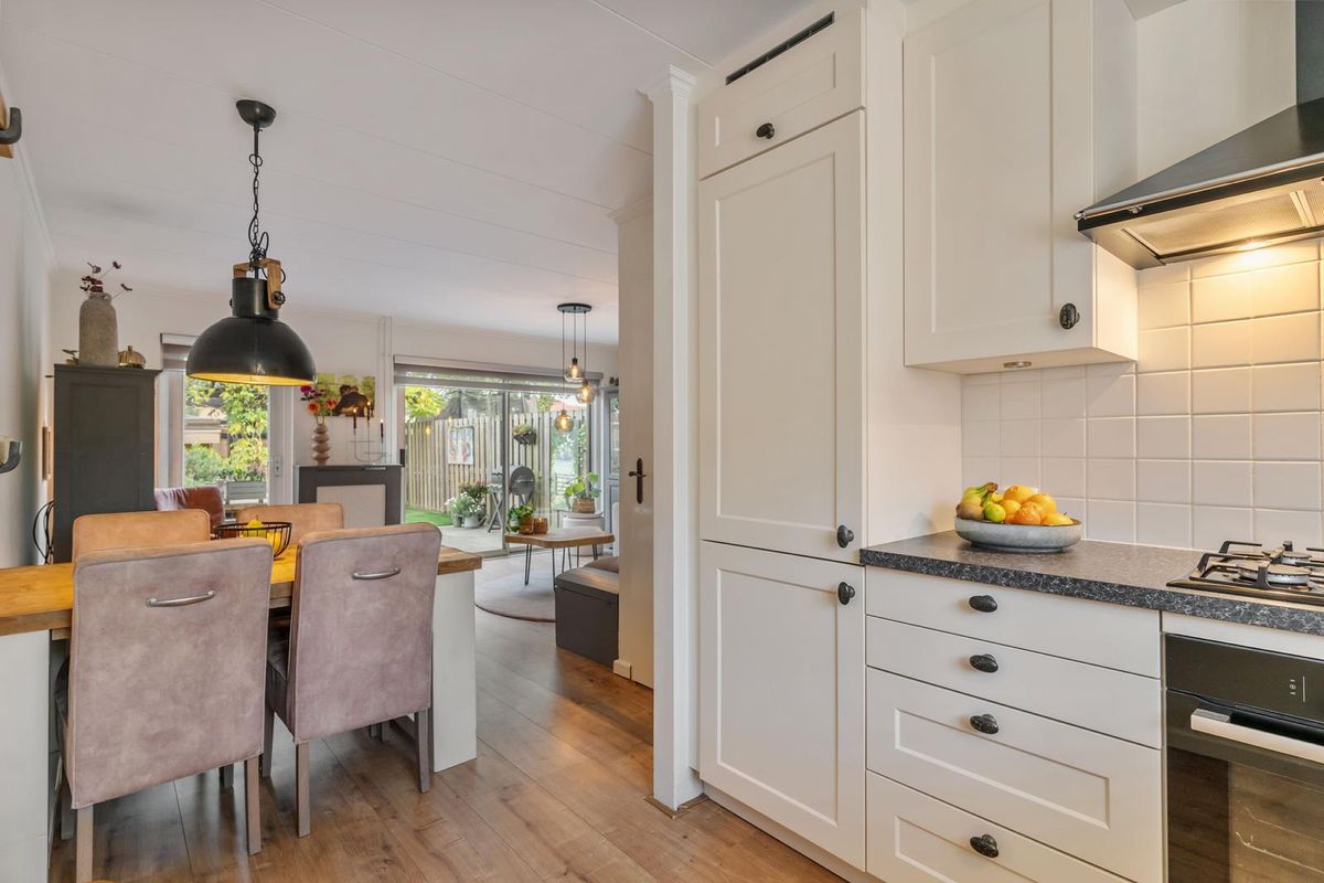 De woonkamer is heerlijk ruim en heeft zowel een grote schuifpui als een openslaande deur naar de achtertuin, waardoor er veel licht binnenkomt en een fijne verbinding met buiten ontstaat. De open keuken aan de voorzijde is ingericht met crèmekleurige kasten en een antracietkleurig kunststof werkblad in L-opstelling. De apparatuur is uitgevoerd in Etna en bestaat uit een gaskookplaat, oven, vaatwasser, koelkast, vriezer en een afzuigkap. Op de begane grond ligt een laminaatvloer met een warme, rustieke uitstraling.