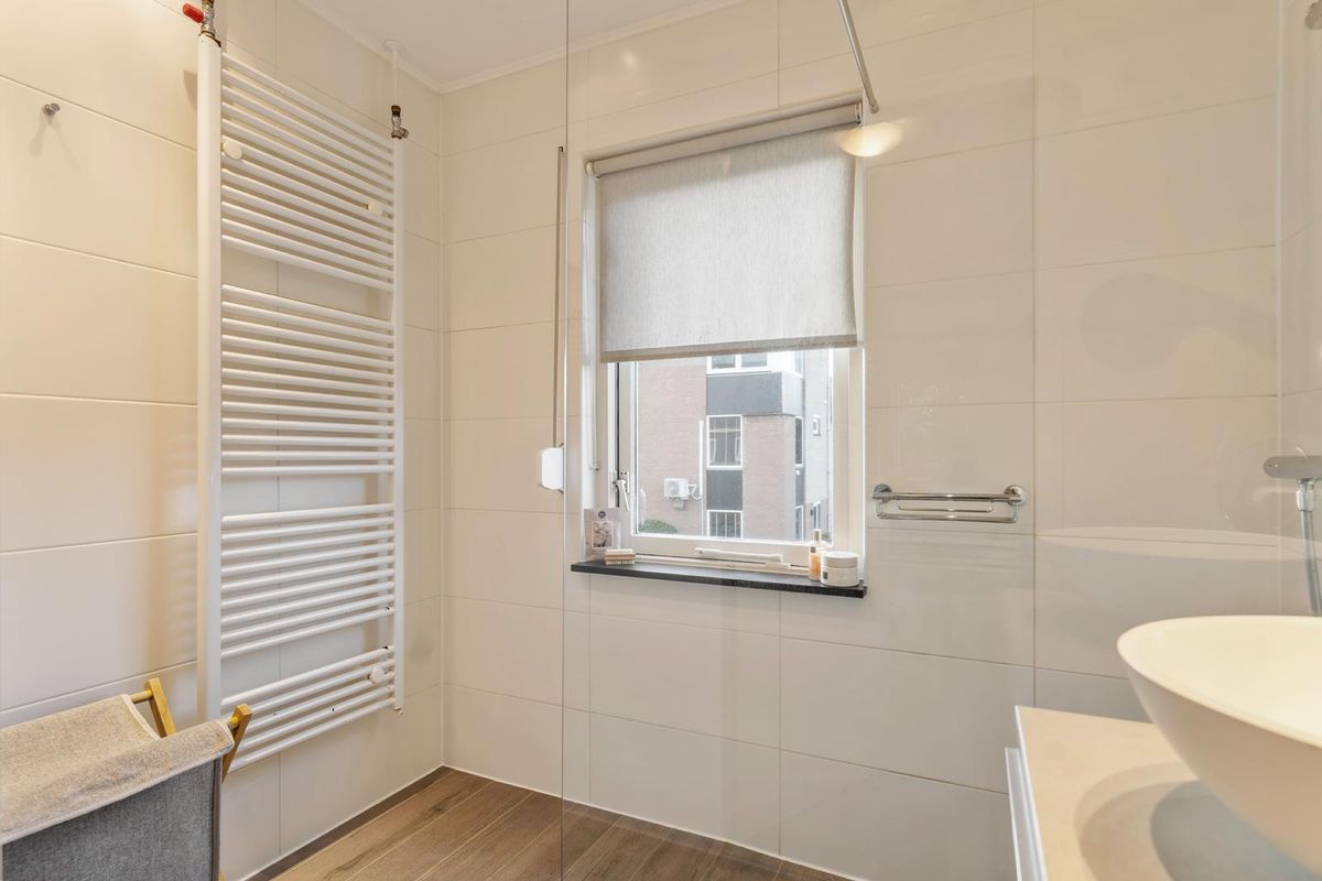 Op de verdieping liggen drie slaapkamers, ieder met een praktische vinylvloer en rolluiken. De overloop is voorzien van vloerbedekking. De badkamer heeft een moderne uitstraling dankzij de houtlook vloertegels, witte wandtegels, een ruime inloopdouche met thermostaatkraan en glazen wand, een badmeubel met waskom en een designradiator. Ook hier zorgen rolluiken voor comfort en privacy.