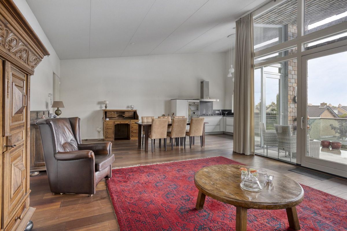 De woonkamer is heerlijk ruim en sfeervol, met grote raampartijen en een houten vloer.
