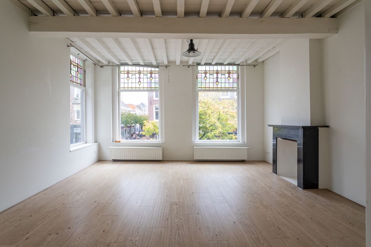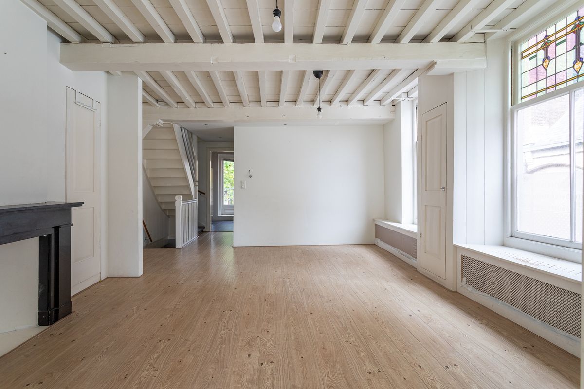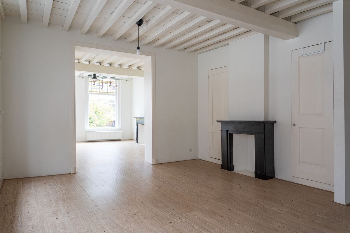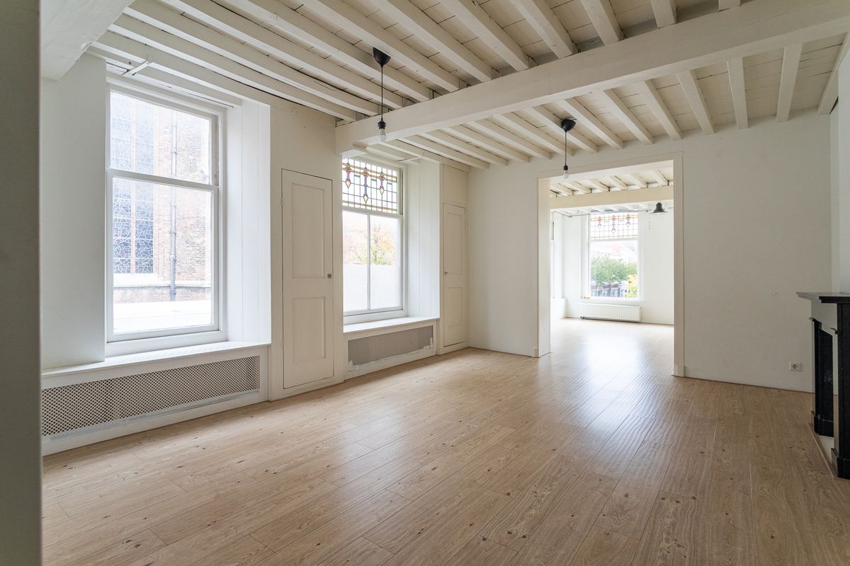 Op de eerste verdieping vind je de ruime woon- en eetkamer aan de voorzijde met veel lichtinval en zicht op de historische omgeving. De originele balken en hoge plafonds geven de ruimte karakter. Aan de achterzijde bevindt zich de royale keuken, voorzien van diverse inbouwapparatuur. Vanuit de keuken geven openslaande deuren toegang tot het dakterras van circa 19,6 m², een heerlijke plek om van de middag- en avondzon te genieten. Via de hal zijn tevens het toilet en de trap naar de tweede verdieping bereikbaar.