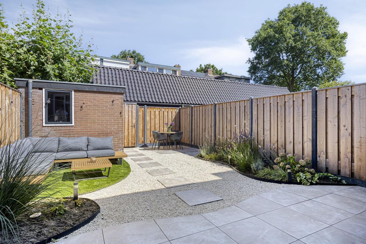Een tuin op het noorden? Geen probleem! Dankzij de diepte van de achtertuin geniet je volop van de zon én heb je tijdens warme dagen altijd een plekje in de schaduw. In 2024 is de tuin opnieuw aangelegd en via de openslaande deuren stap je er zo in. De achtertuin is deels bestraat en beschikt over een stenen (fietsen)berging en een poort naar de gezamenlijke achterom.