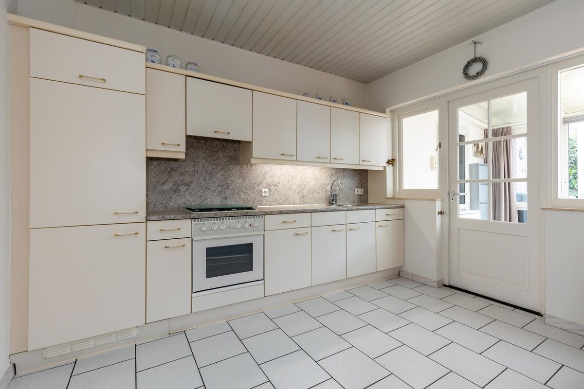 De open keuken (3.50*2.70m) is voorzien van een tegelvloer en uitgevoerd in een rechte opstelling en uitgerust met de navolgende apparatuur; 4-pits gaskookplaat, afzuigkap, koelkast en oven.