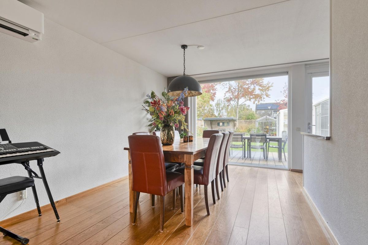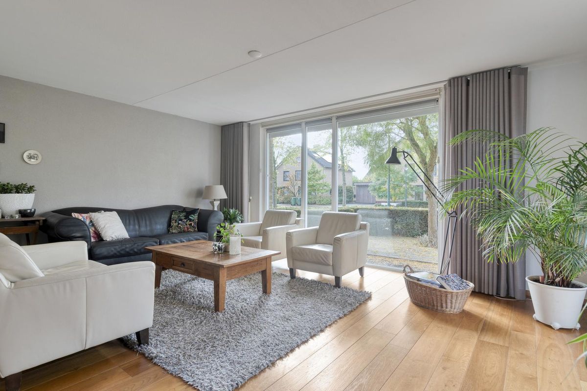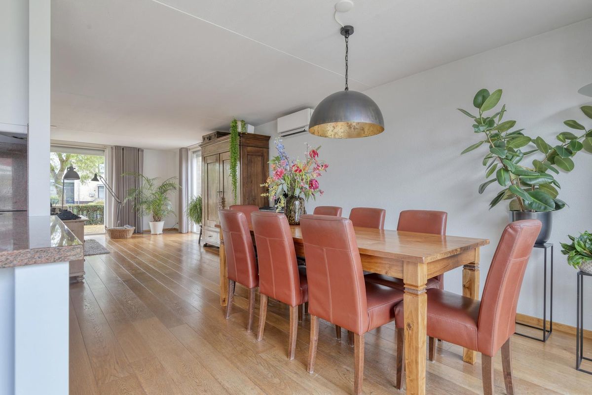 De woonkamer is een heerlijke plek om te verblijven. De vele raampartijen rondom zorgen voor daglicht en creëren een open, luchtige sfeer. De mooie eikenhouten vloer brengt warmte in het interieur, terwijl de stucwanden en airconditioning zorgen voor comfort en een moderne afwerking. Dit is een woonkamer waar je elk moment van de dag wilt zijn — gezellig samen of juist even helemaal tot rust komen.