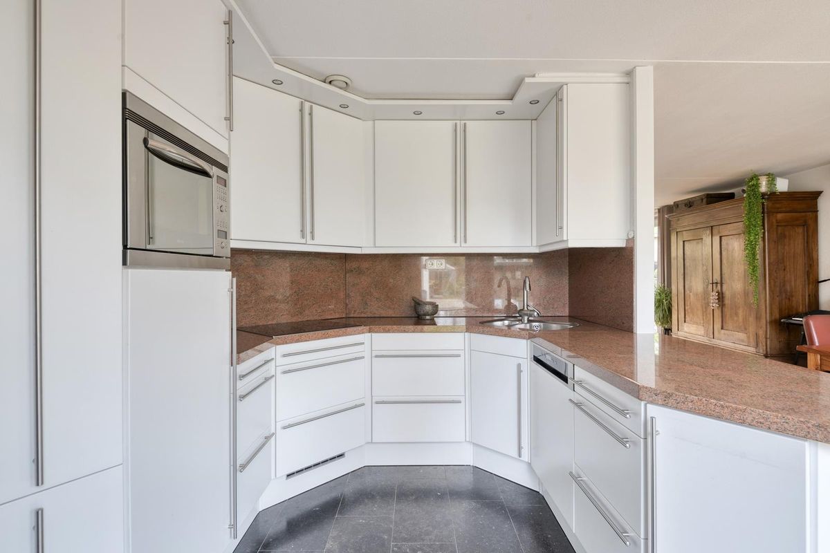 Aan de achterzijde van de woning bevindt zich de open keuken, praktisch ingericht en voorzien van alle gemakken. Je vindt hier een 4-pits inductiekookplaat, afzuigkap, combi-oven, koelkast, vaatwasser en volop bergruimte. Vanuit de keuken loop je via een deur direct de tuin in — ideaal tijdens zomerse dagen of wanneer je buiten wilt eten. Een tussenhal verbindt de keuken met de bijkeuken en de tuinkamer.