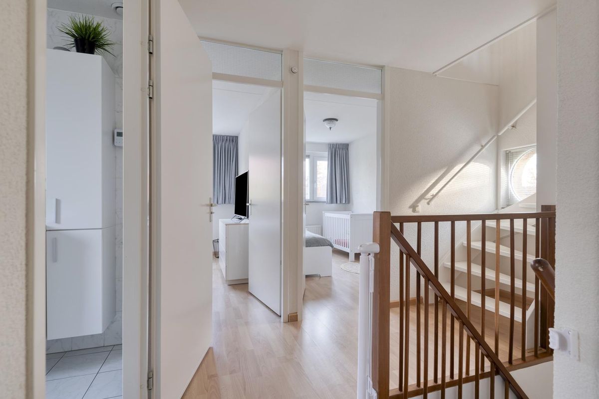 Vanaf de overloop heb je toegang tot drie ruime slaapkamers, de badkamer, een separaat toilet en de trap naar de tweede verdieping.