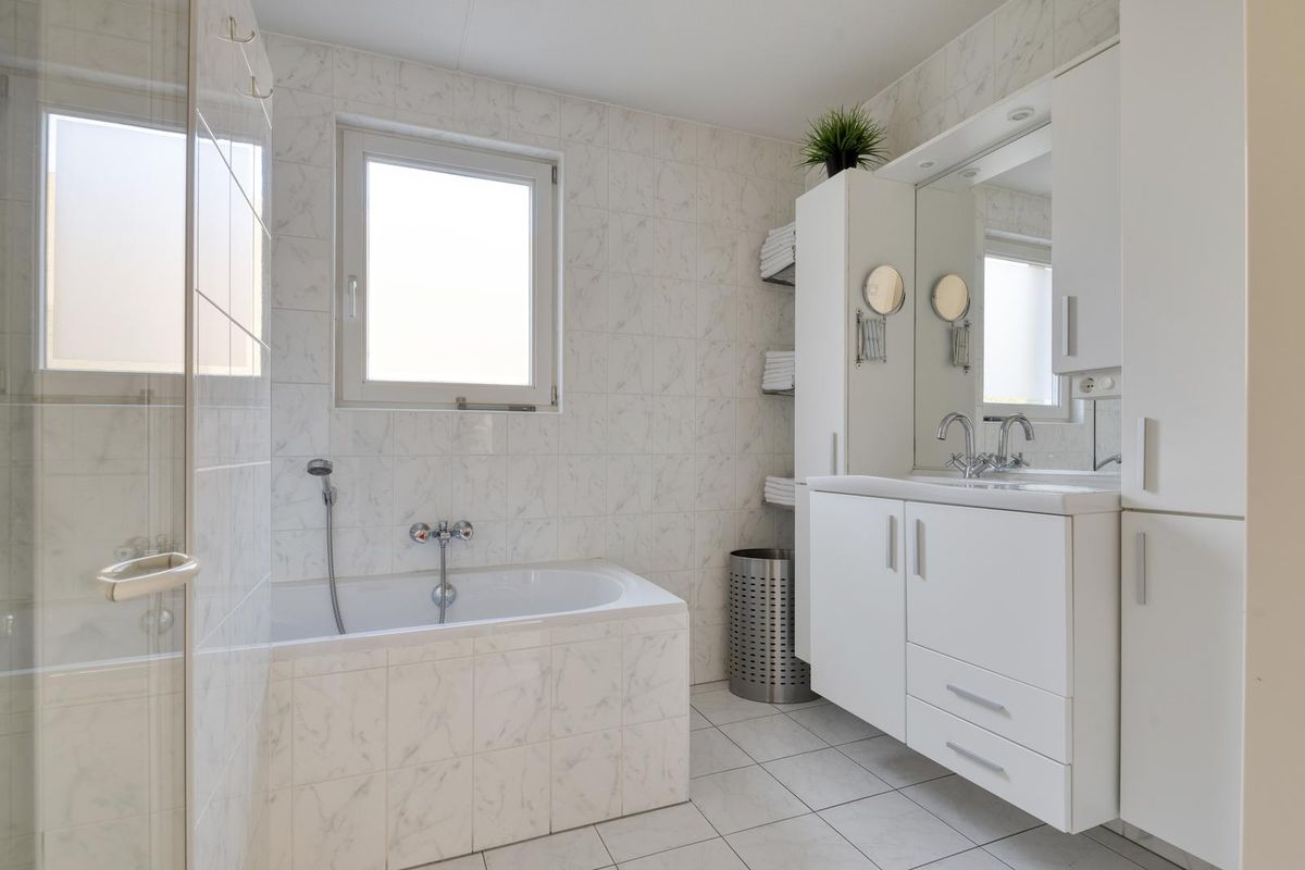 De badkamer is comfortabel ingericht en biedt alles wat je nodig hebt om de dag ontspannen te beginnen of juist rustig af te sluiten. Je vindt hier een ligbad, een aparte douche en een fraai wastafelmeubel met veel opbergruimte.
