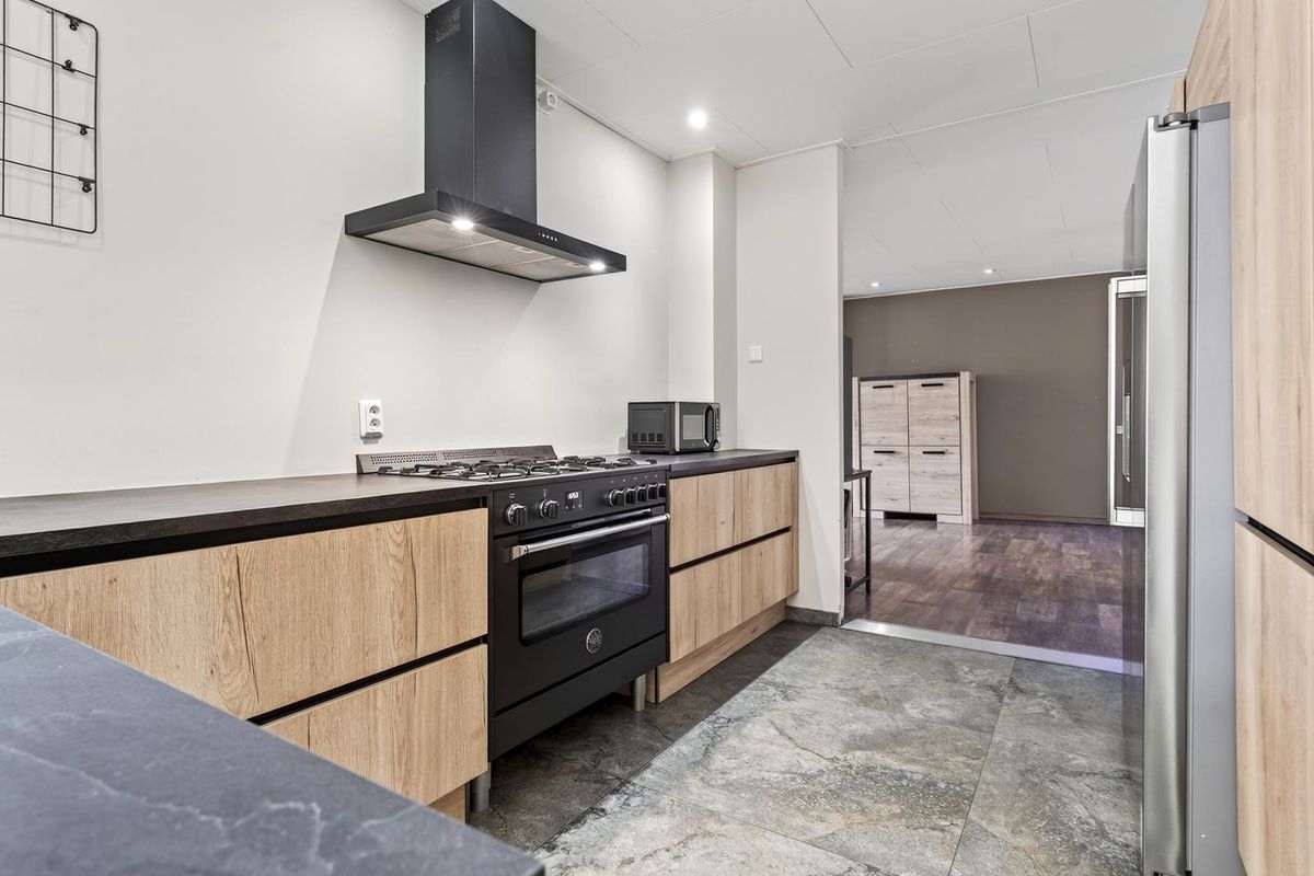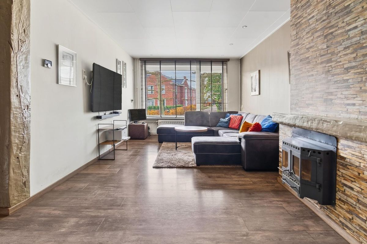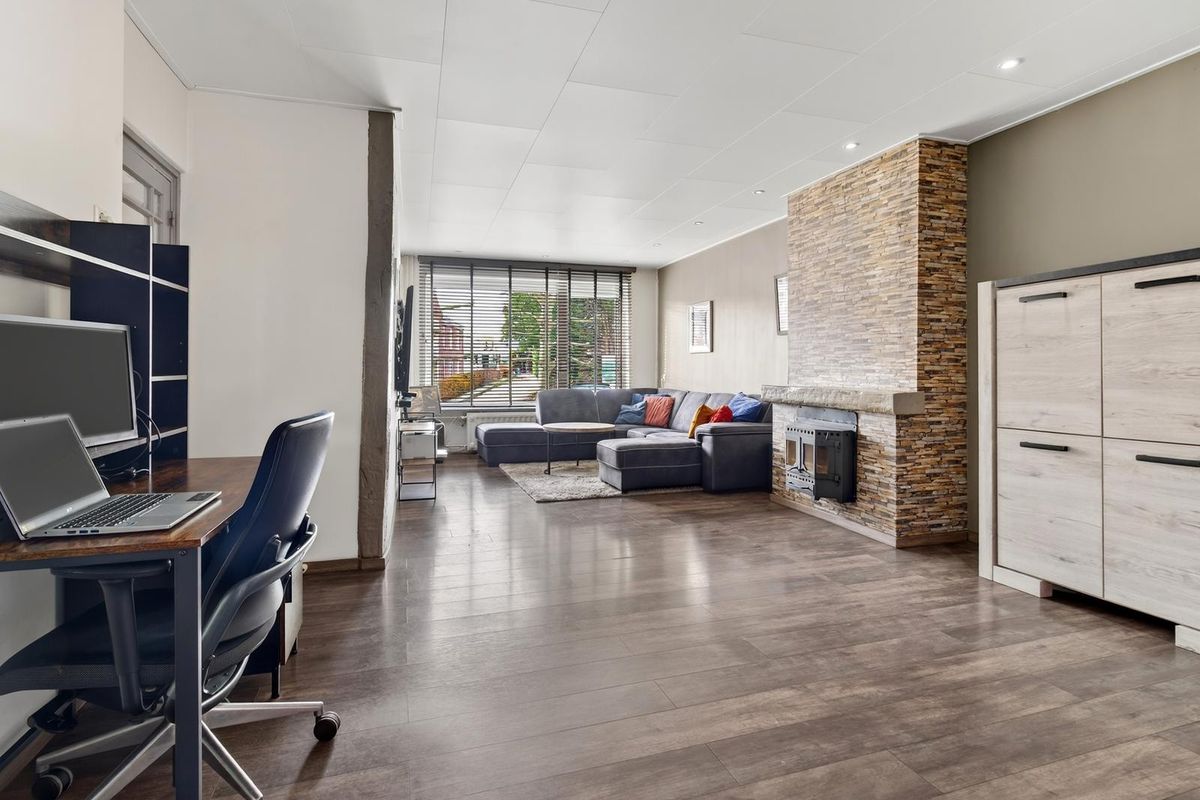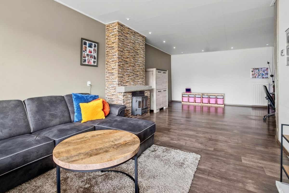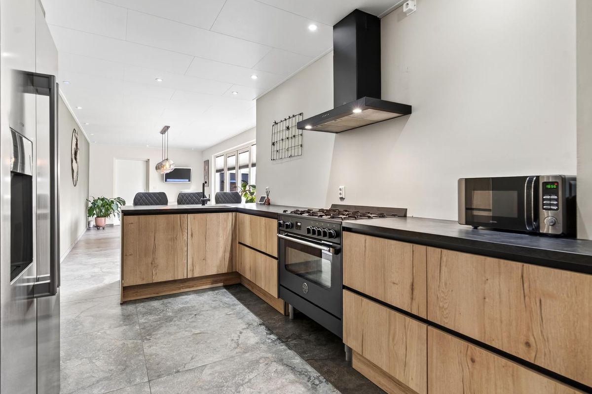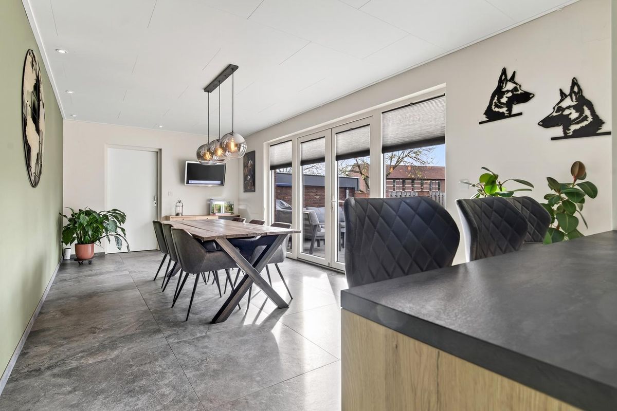 De woonkamer heeft een laminaatvloer, grote raampartijen met elektrisch rolluik en een sfeervolle (niet in werking zijnde) open haard. De open keuken is modern ingericht met een 5-pits gasfornuis, grote oven, afzuigkap, vaatwasser, Amerikaanse koelkast. Vanuit de keuken loop je door naar de aanbouw met bar, eetgedeelte en toegang tot de garage en tuin. Zowel de keuken als de aanbouw zijn voorzien van vloerverwarming.