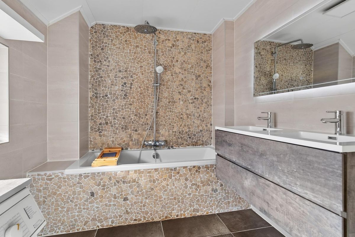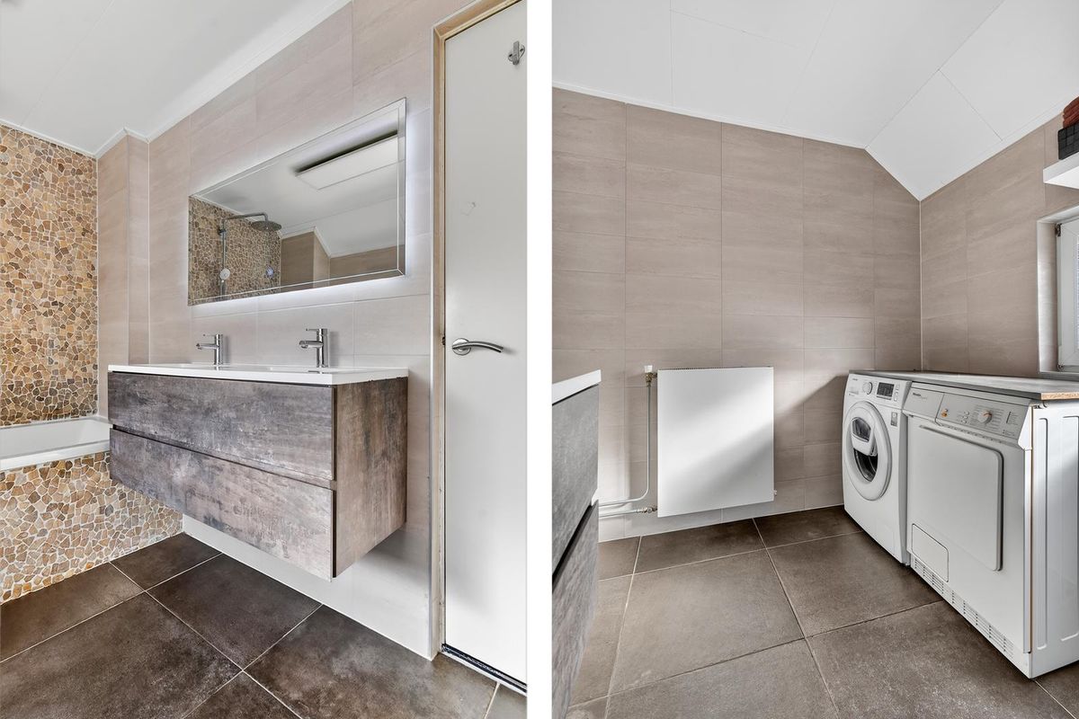 De hal is betegeld en voorzien van een meterkast, garderobe, aparte toiletruimte met sensorverlichting, toegang tot de badkamer, woonkamer, kelder en de trap naar de eerste verdieping. De badkamer is modern uitgevoerd met twee wastafels en een meubel, witgoedaansluiting, een ligbad met bubbelbadfunctie, douchekop en spiegel met verlichting.