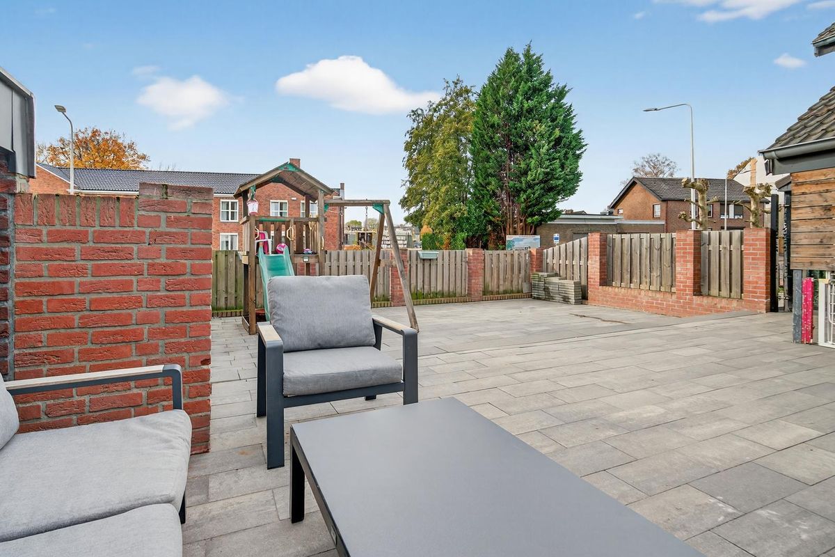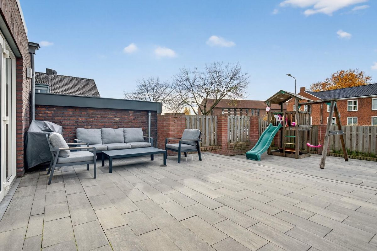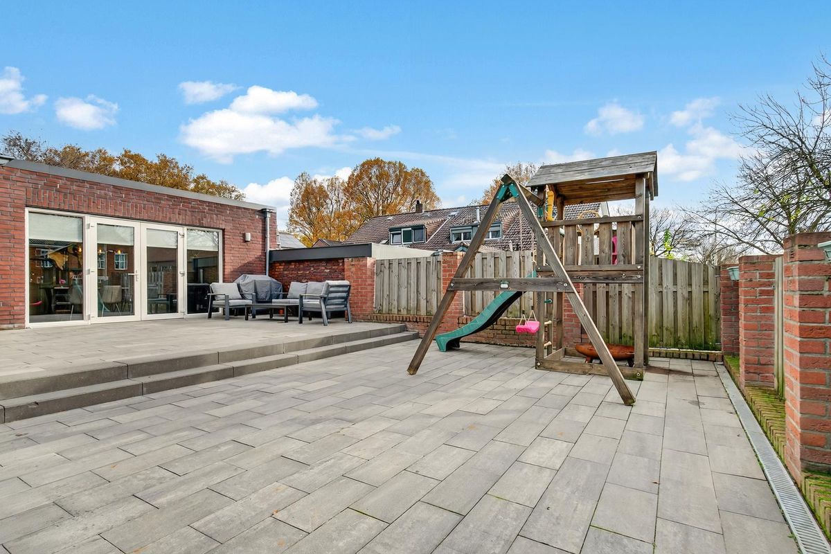 De tuin is onderhoudsvriendelijk ingericht met een betegeld terras en zithoek, volledig omsloten door een houten schutting. Via de zijkant is de tuin bereikbaar via een poort.