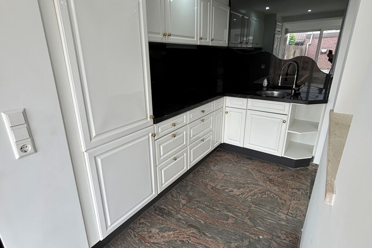 Keuken 3,05 x 1,75 met granieten vloer, inbouwspots, hoogglans aanbouwkeuken met granieten werkblad en achterwand, inductie kookplaat met nieuwe afzuigunit, draaideurcarrousel, losse vaatwasser, losse koel/vriescombinatie en spoelbak.