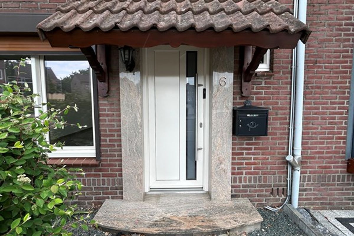 Voortuin met bestrating, beplanting, siergrind, afdakje bij voordeur, brievenbus en verlichting.