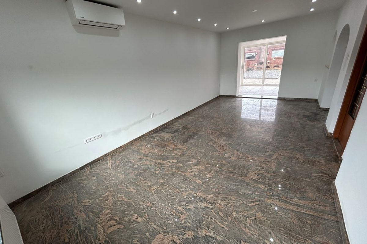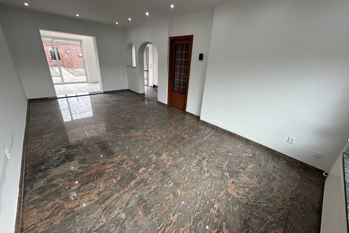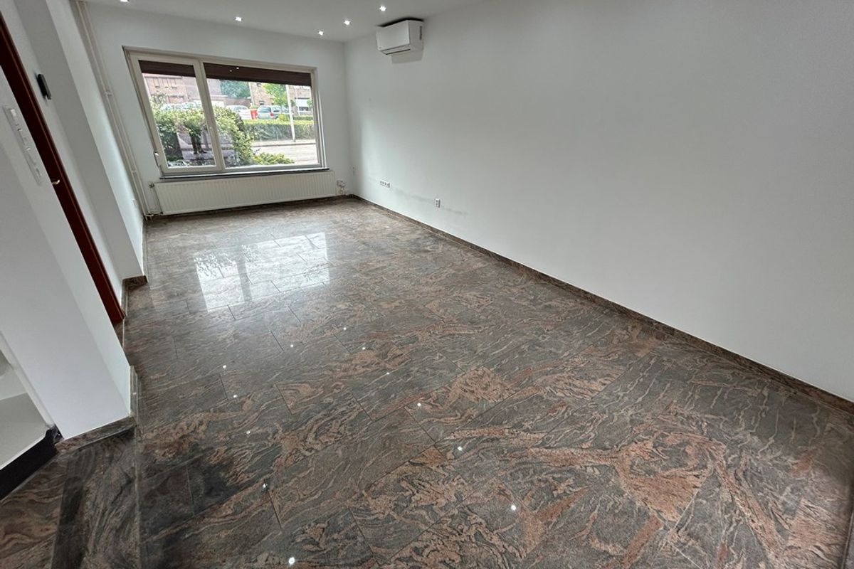 Woonkamer 6,80 x 3,40 met granieten vloer, inbouwspots, airco (warm/koud), doorgang naar aanbouw en half open keuken.
