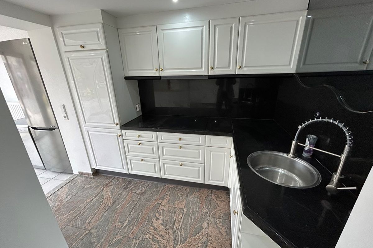 Keuken 3,05 x 1,75 met granieten vloer, inbouwspots, hoogglans aanbouwkeuken met granieten werkblad en achterwand, inductie kookplaat met nieuwe afzuigunit, draaideurcarrousel, losse vaatwasser, losse koel/vriescombinatie en spoelbak.