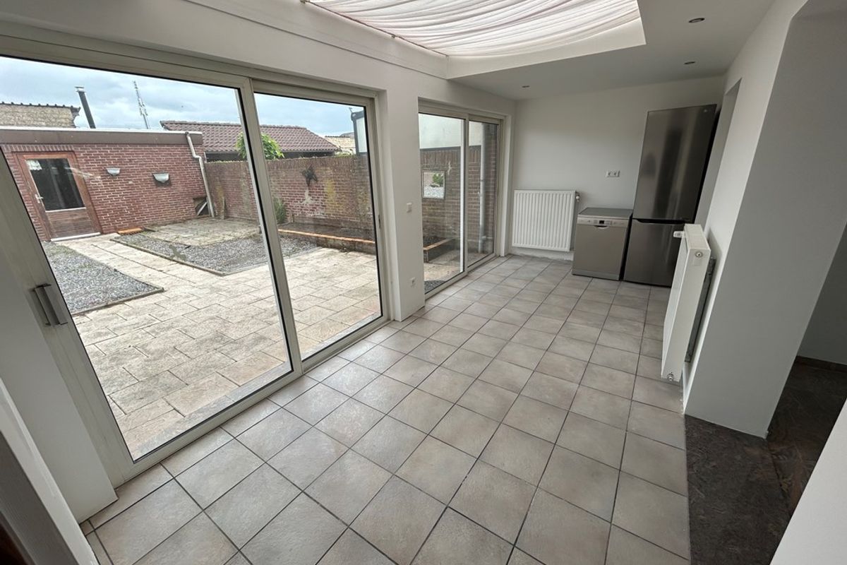 Aanbouw 5,60 x 2,40 met plavuizenvloer, 2 schuifpuien naar achtertuin en deur naar garage.