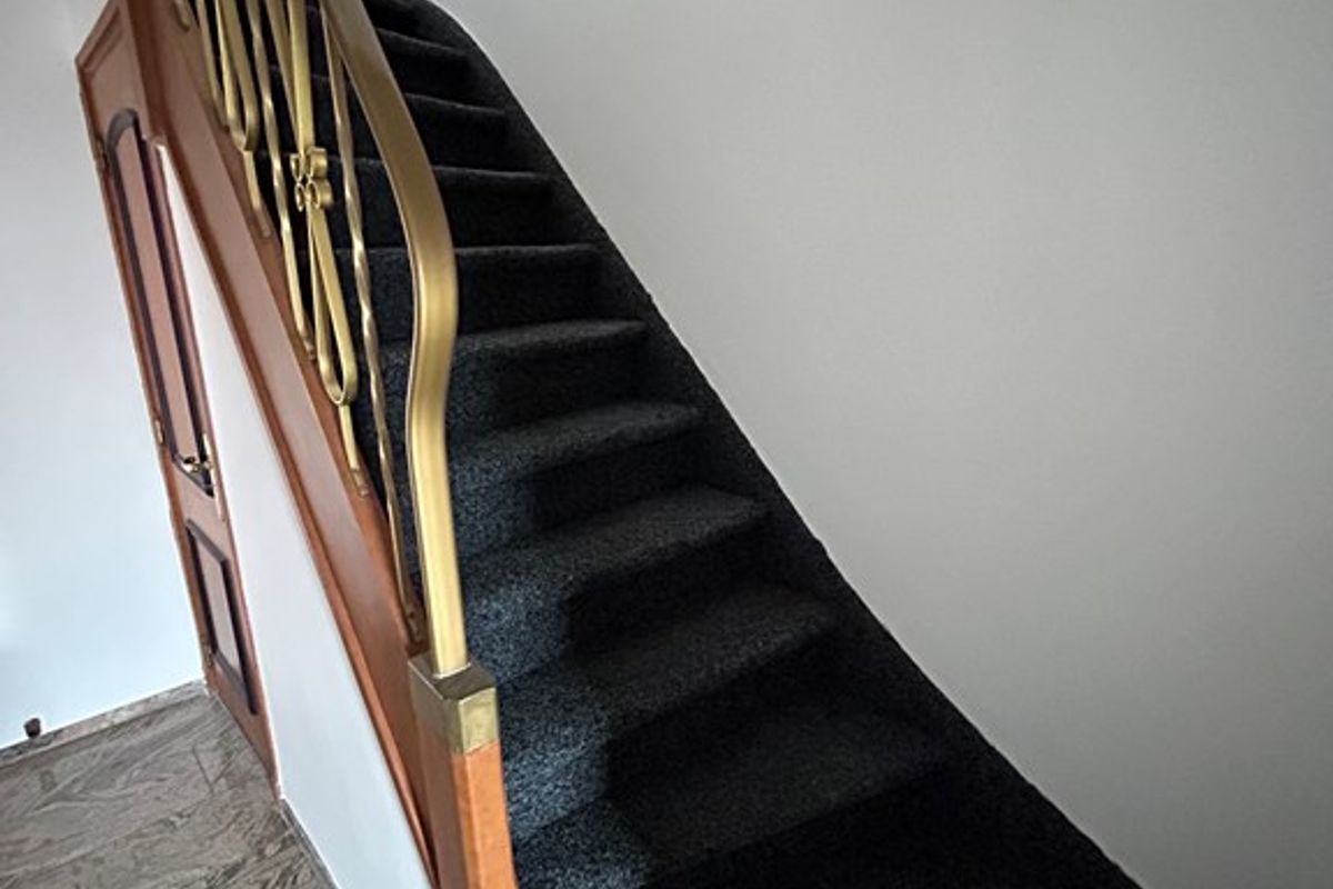 Overloop 2,50 x 0,80 met granieten vloer en vaste trap naar zolderverdieping.
