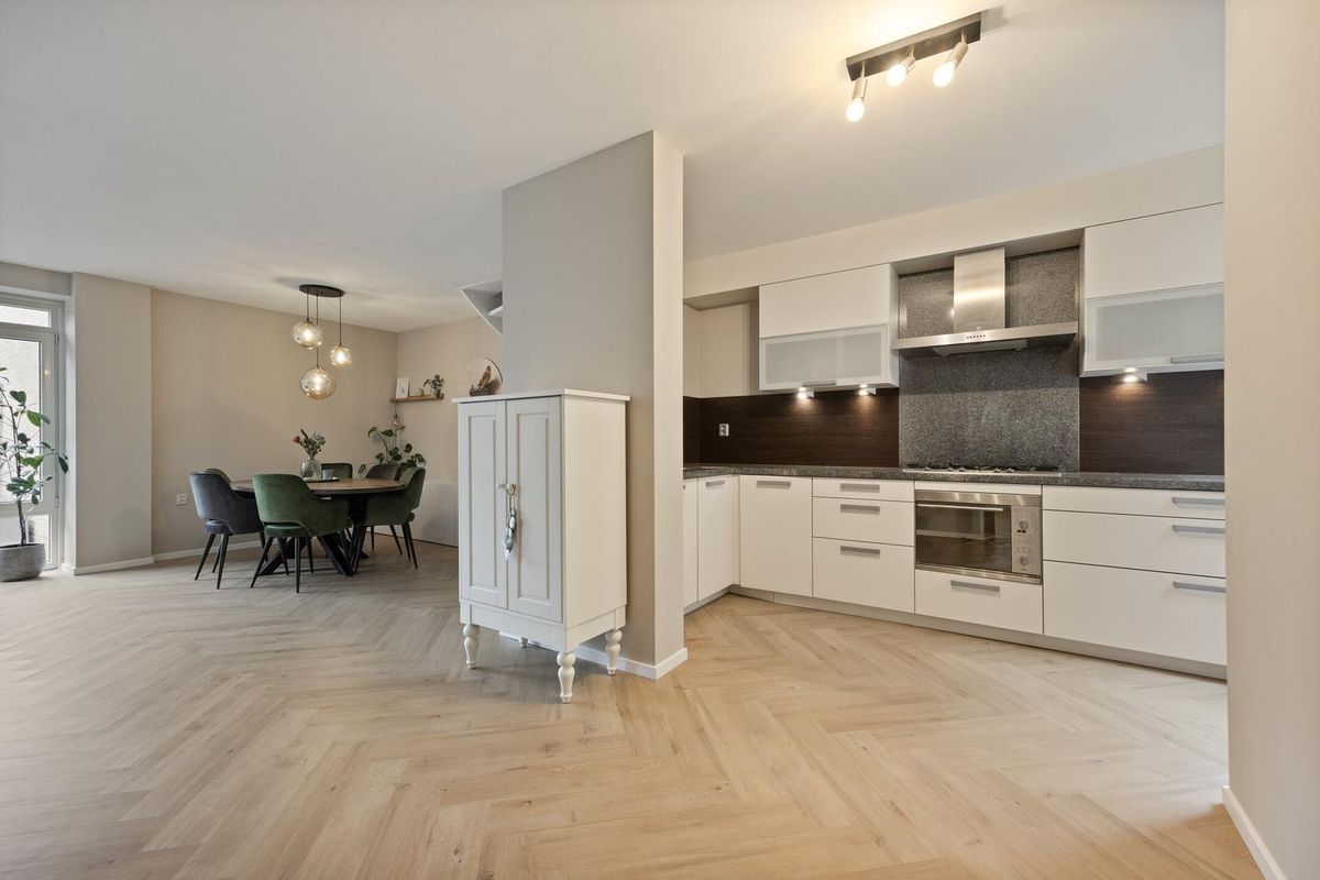 Aan de achterzijde van de woning vind je de lichte en ruime woonkamer, waar grote raampartijen zorgen voor een zee aan daglicht. De ruimte is zó ingedeeld dat je moeiteloos een royale zithoek én een grote eettafel kunt plaatsen. Hier komen gezelligheid, ontspanning en samenzijn naadloos samen. Denk aan filmavonden, lange diners met vrienden of een rustige ochtend met een kop koffie in het zonnetje dat naar binnen valt. De open keuken ligt aan de voorzijde van de woning en is keurig afgewerkt met witte kastfronten en voldoende werkruimte. Dankzij het raam aan de straatzijde kook je hier met daglicht op je gezicht. De keuken is voorzien van een gasfornuis, combi-oven/magnetron, koel-vriescombinatie, en vaatwasser, alles wat je nodig hebt om de lekkerste maaltijden op tafel te zetten. Een praktische én sfeervolle plek!