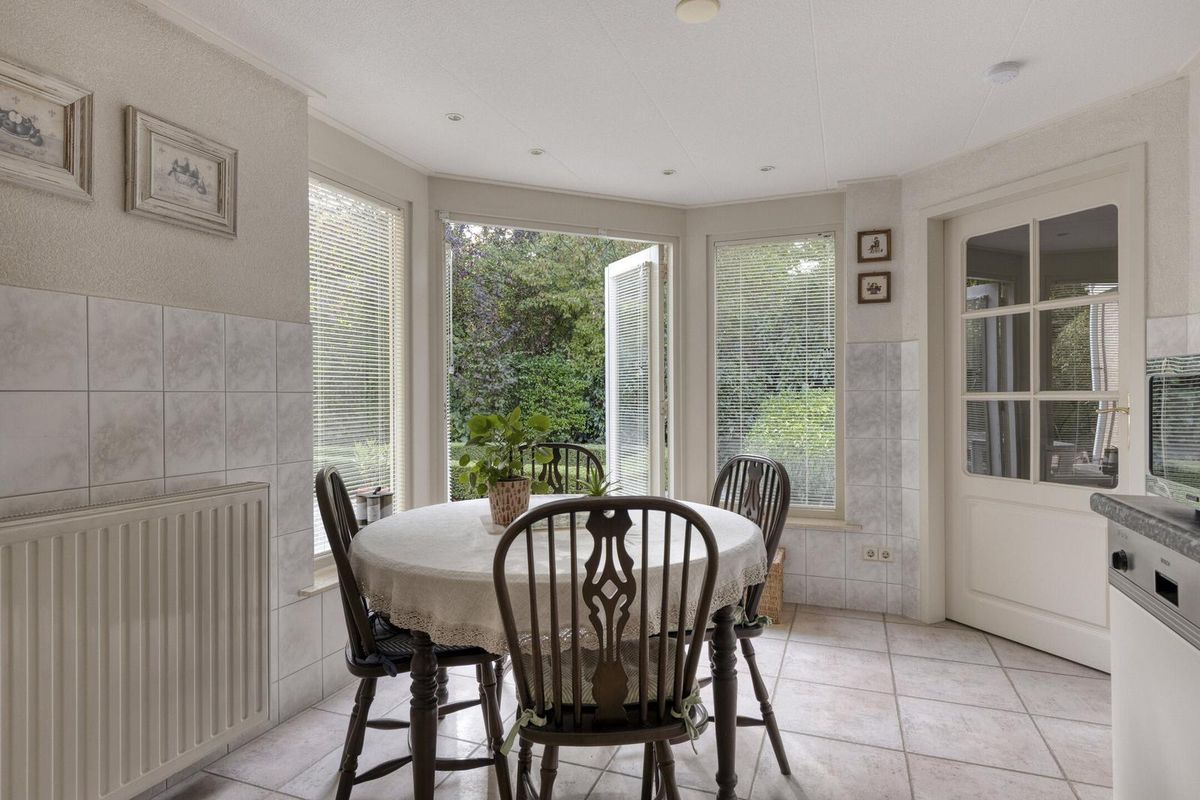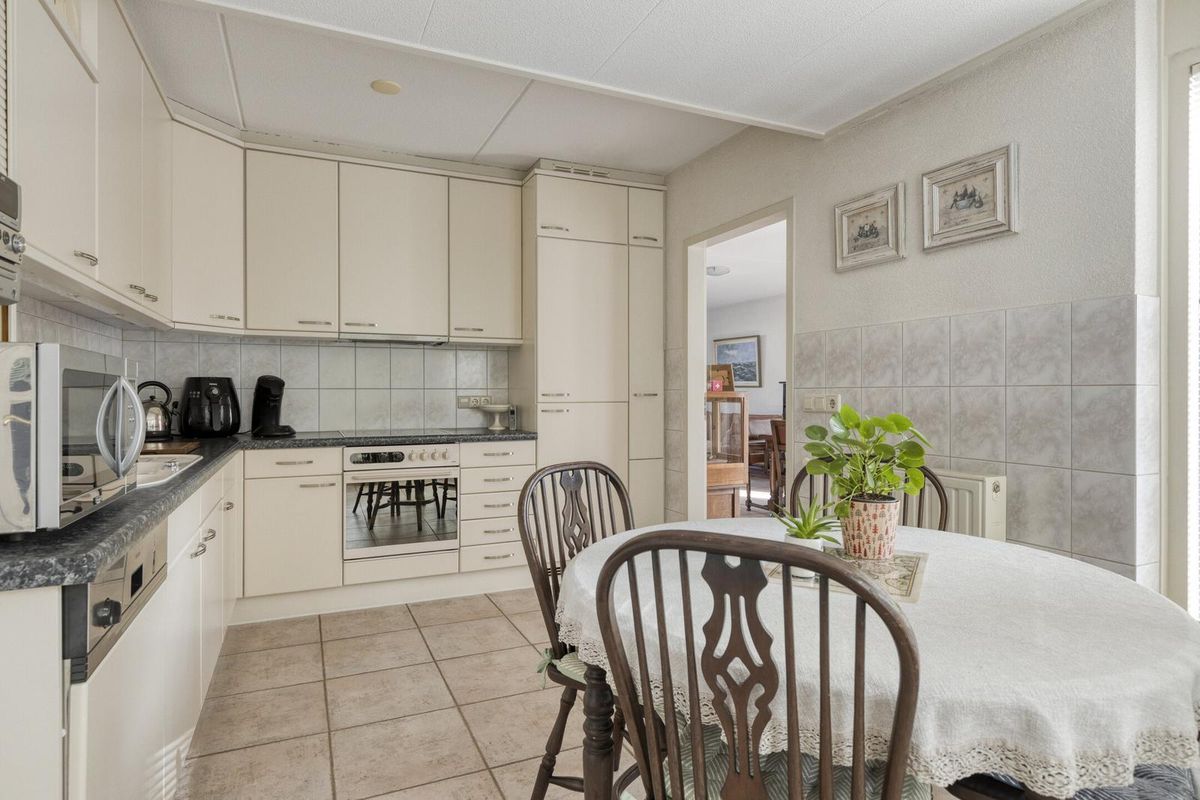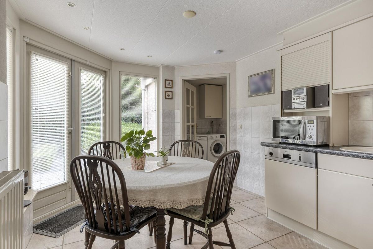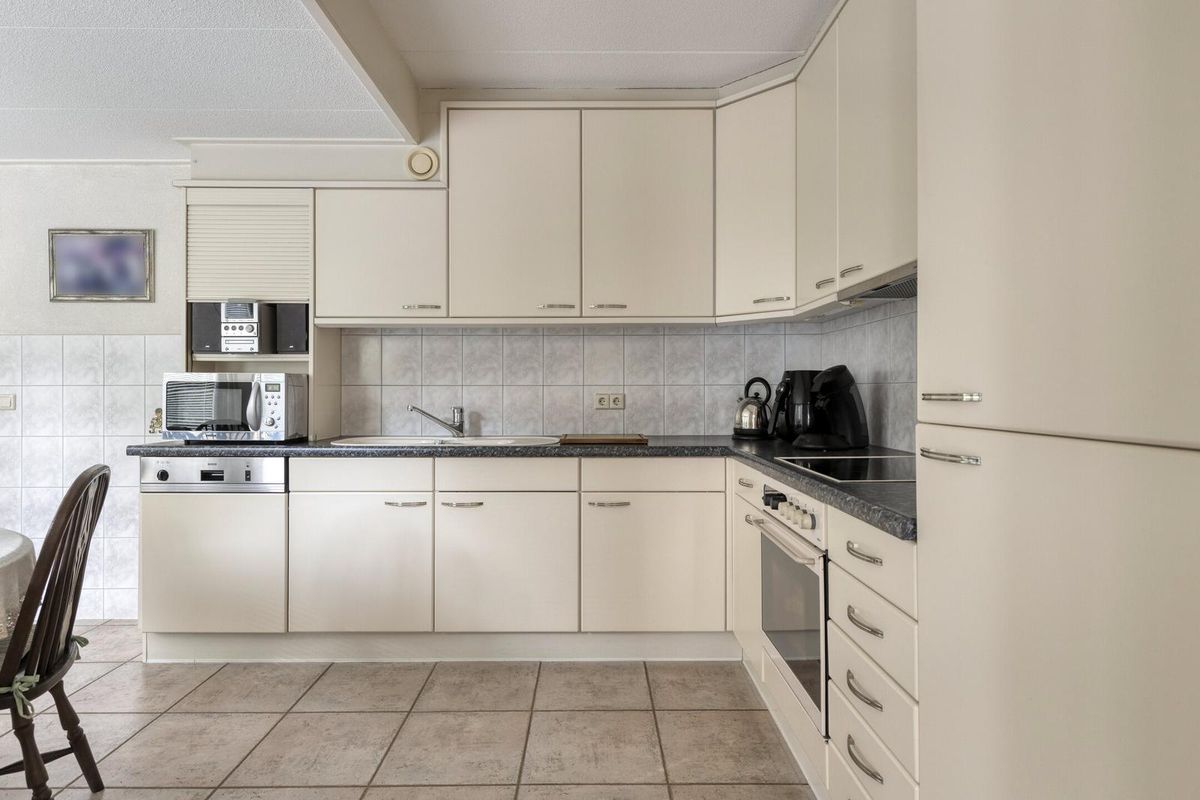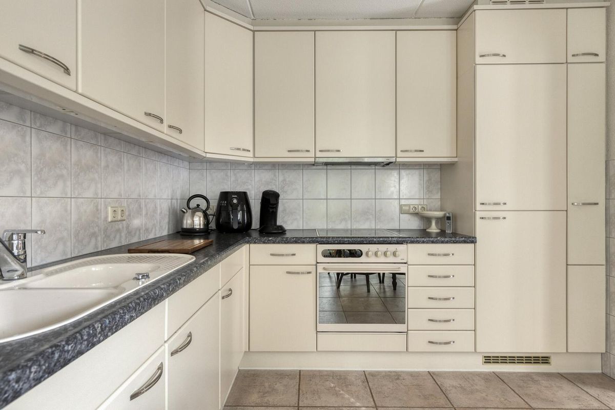 De dichte keuken ligt aan de achterzijde van de woning en heeft een praktische opstelling met diverse inbouwapparatuur, waaronder een koelkast, vriezer, oven, keramische kookplaat, vaatwasser en afzuigkap. Hier is voldoende ruimte voor een eettafel, waardoor het een fijne plek is om samen te komen.
