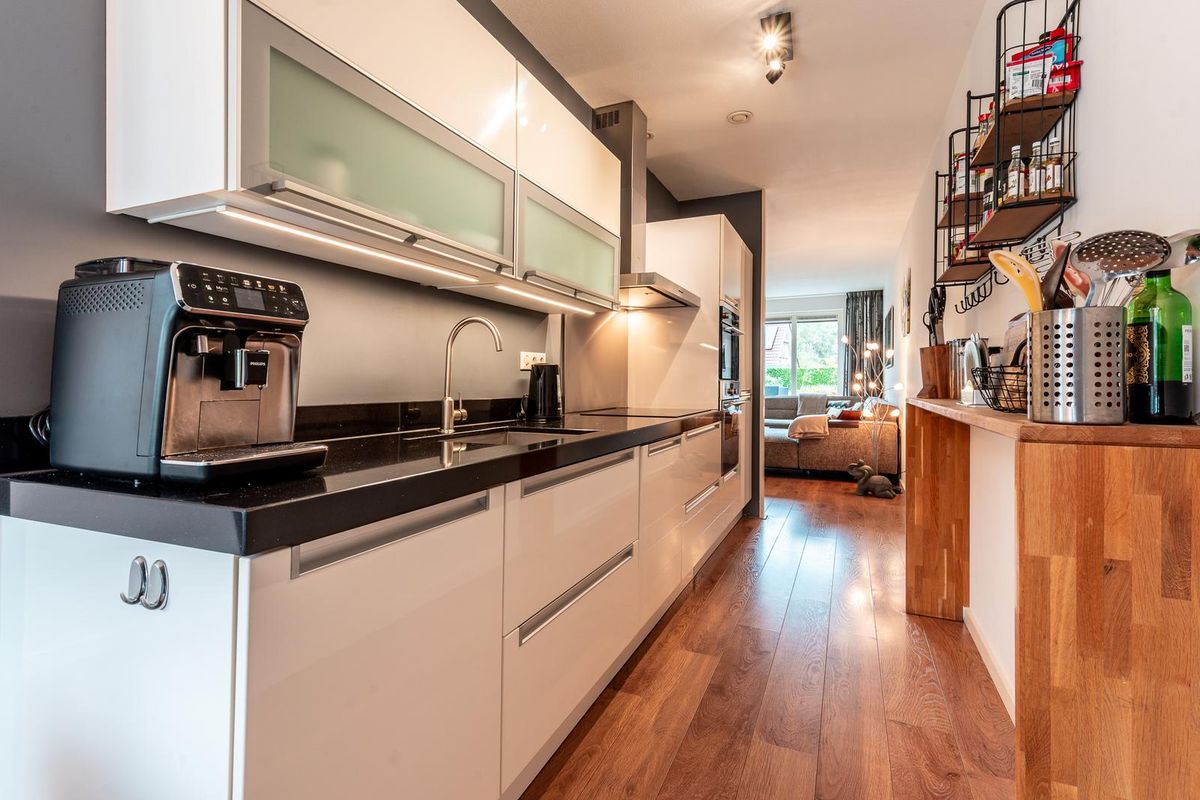 De open keuken is modern en praktisch ingedeeld, voorzien van diverse inbouwapparatuur en voldoende werk- en kastruimte. Vanuit de keuken loopt u direct door naar de eetkamer, een sfeervolle ruimte waar u gezellig met familie of vrienden kunt tafelen, terwijl u in contact blijft met zowel de keuken als de woonkamer.